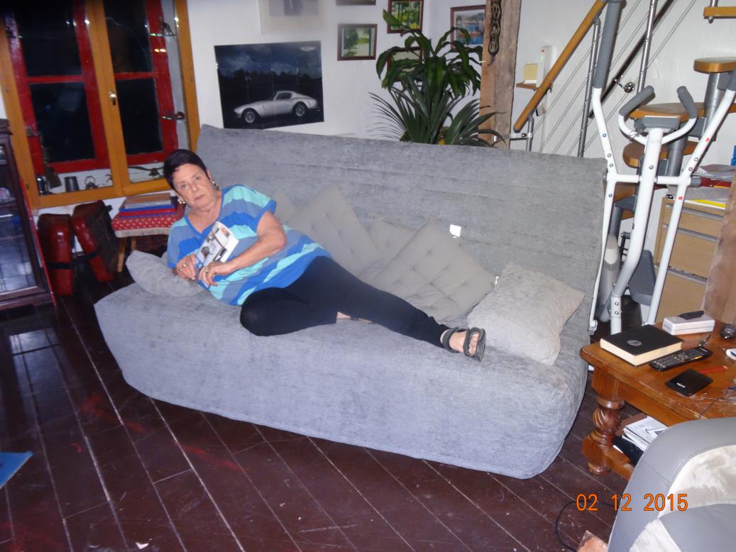 Lynne, sort of smiling on the new sofa bed. We got it as we have friends come over in the winter and the gites are shut down as there's no heating in them. (and this is Lynne, because the other stuff was looking worse for wear).