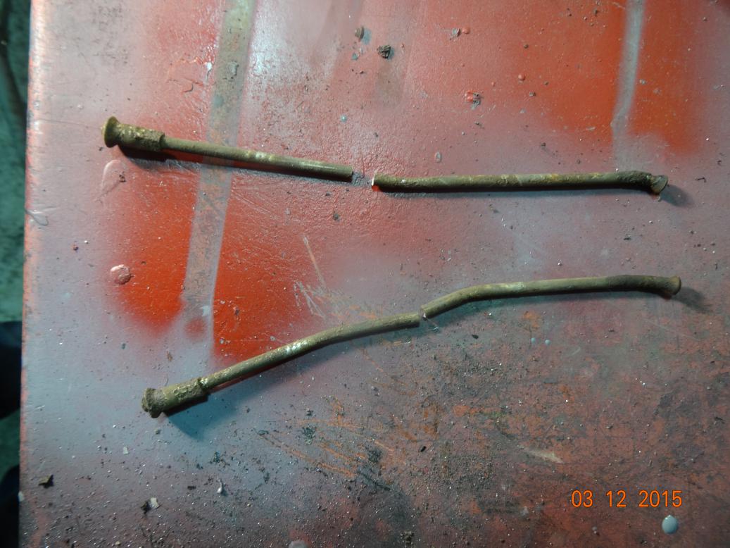 The two spokes I removed yesterday. I cut them , but you can see how twisted they were from having wire tightly wrapped around them.