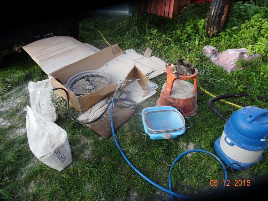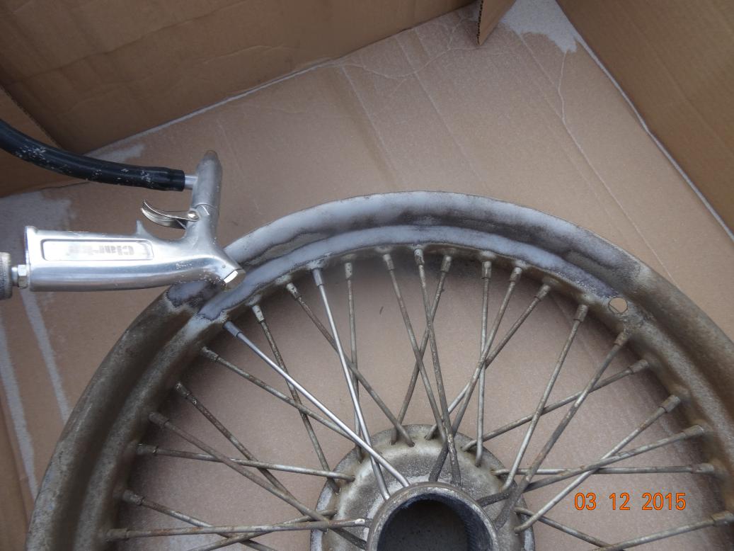 Started at 0820 and welded the side screen frame. Good news is I can see much better since yesterday and was able to do a better job than the first attempt. It's not perfect but OK. I then set up the sand blaster. I have two sacks of sand in the back of the Land Rover so backed the LR in front of the workshop. Cut a box to use for collecting the sand and got the airline, the blast gun, the vacuum cleaner and.. oh yes the wheel. Cut a slot in the top of one of the bags and pushed the pick up pipe in. Started blasting but it stopped. Went to the sack to wiggle the pick up and realised the sand was very damp. Oh well that will have to wait for next summer to dry out. The wheel blasted up well but not the areas with oil and grease. I then washed out the large cleaning tray, poured some petrol in and washed the wheel thoroughly. I then set up the jet wash, got another cardboard box (not short of them) and, in the middle of the field, jet washed the wheel. I took the wheel into the house, put the new gas fire on, and dried the wheel. Only took about 10 minutes whilst I had a coffee. I then gave the wheel another blast with the sand and it was as good as it was going to get. Placed the wheel on the bench and gave it the first coat of primer. Had lunch and half an hour later, went back and gave it a second coat. Then watched the rest of Bargain Hunt and, at 1400, gave it the third and final coat of primer. I now started to rub down and prepare to paint the side screen frames. I have an aerosol tin but I'm spraying it into the lid and brushing it on. Before starting to paint the frame I took the vacuum cleaner apart as it was making loud clanging noises and whistling. Got it apart and found the fan has disintegrated. Oh well a new vacuum cleaner tomorrow. I then applied the first top coat of silver to both sides of the wheel. I did not overspray so it wasn't fully covering the primer. I carried on brush painting the frames. I would paint one side with it laying on the bench then string it up and, holding the frame with mole grips on one of the brackets, paint the other side. After two frames I gave the wheel a second coat of silver. When the last frame was completed I gave the outside of the wheel a third coat. I'm now writing this up (I do state the obvious sometimes, don't I) and will go back in an hour to fit the new tyre and inner tube. Well, in an hour and a half, which will be 1800.