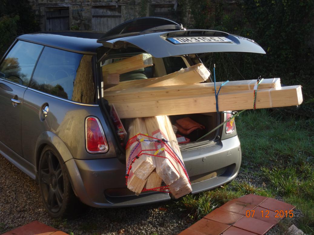 I make my way to Brico Marche and buy 15 packs of floorboard. Amazing how I got it in the Mini. I also buy a pack of bungees to hold them in the car. Get back, bring 7 packs into my rooms, get the circular saw, Paslode nail gun, set square, hand saws etc. and get cracking. Only I don't! The Paslode battery, which has been on charge since yesterday is completely flat. I get the other battery from the second fix gun and that's also 0V. I've tracked down some Paslode dealers and I'm waiting for them to re-open at 1400 to find out if they have a new battery in stock. In the meantime I'm cutting boards to length.... no I'm not, I'm typing this up.