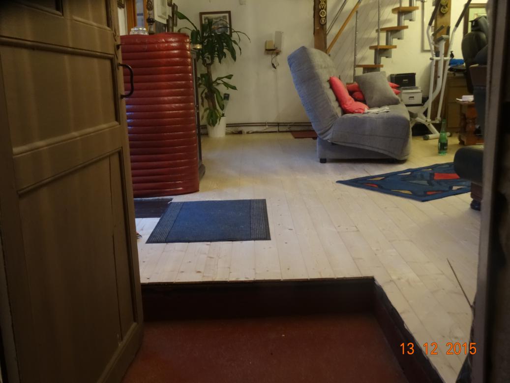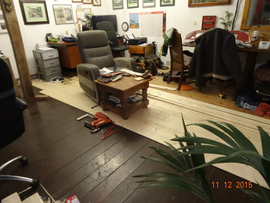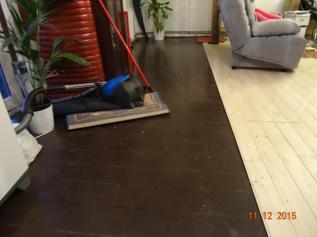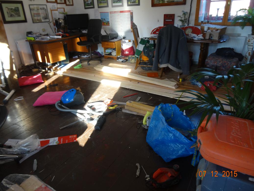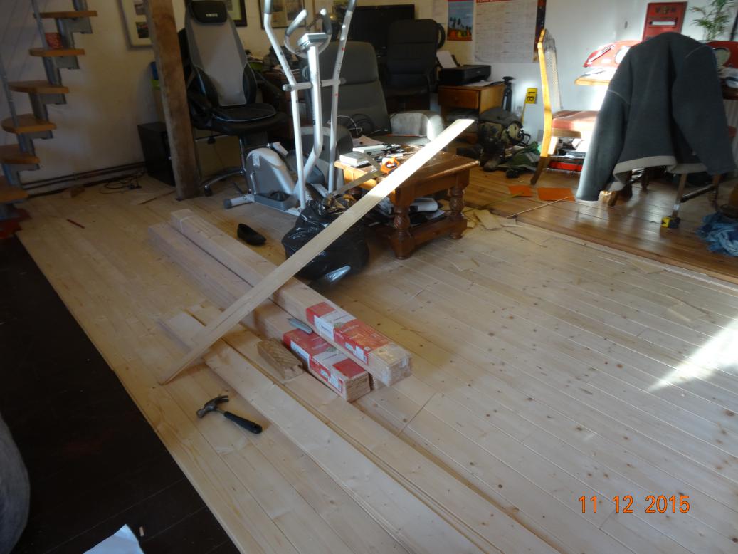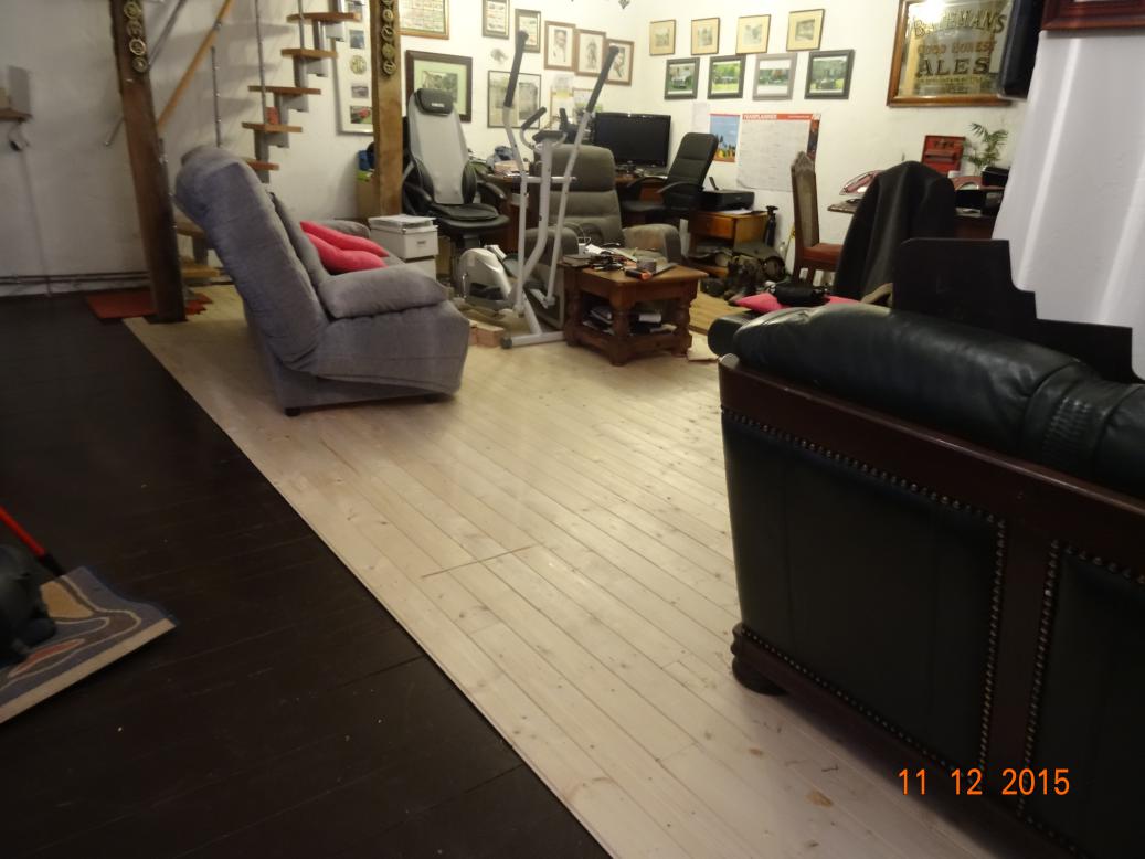 The floor that's being recovered. The light coloured area is the raised plinth. The main part of the floor was stained dark brown by some idiot and it's horrible. So I'm laying these cheap pine boards on top. Not the sunshine. December 7th, brilliant blue sky and warm enough to walk about in a tee shirt.