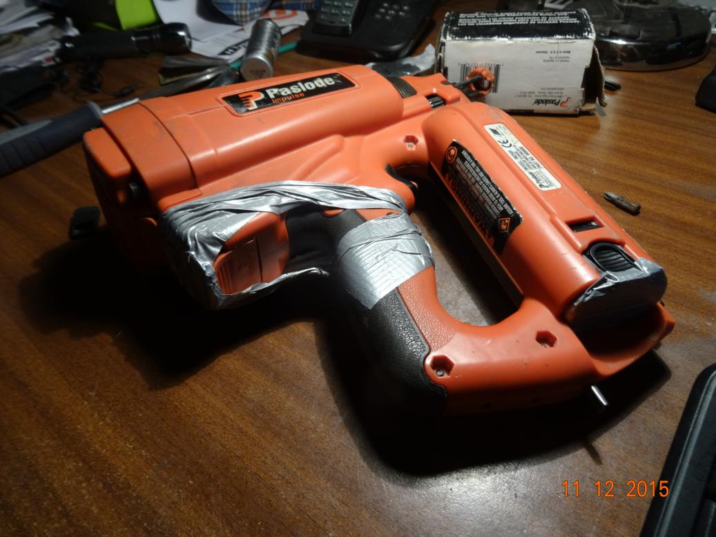 The bloody gun. Gaffa tape holding the battery in and the cap that is supposed to hold the gas in.