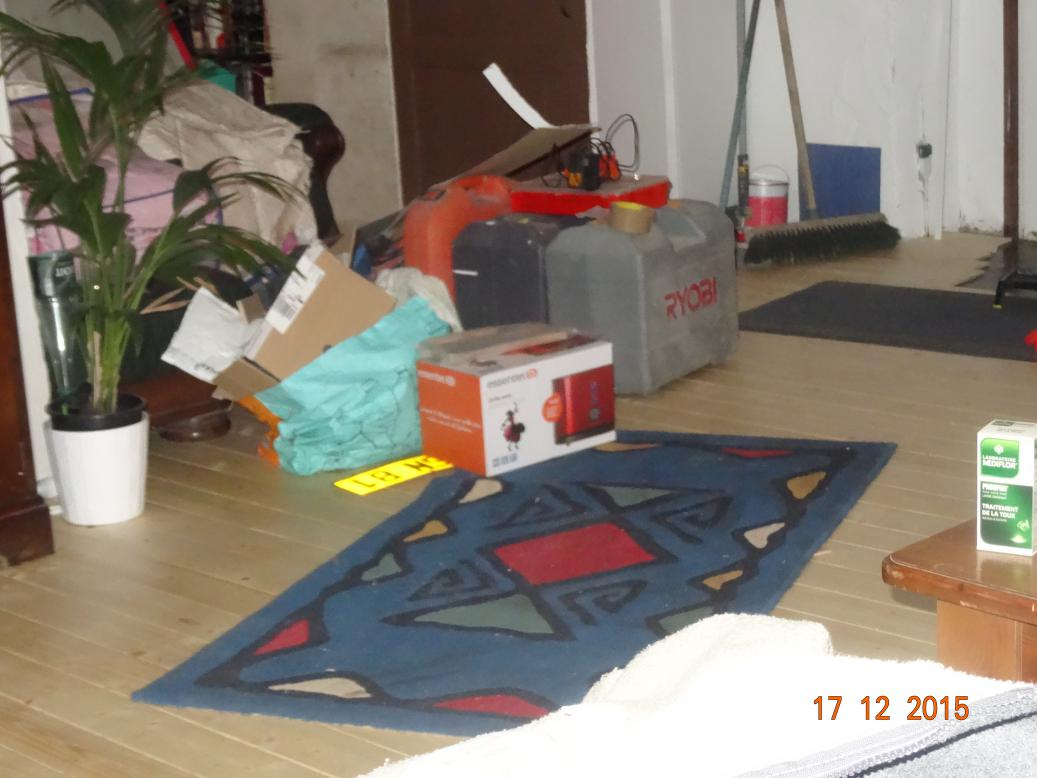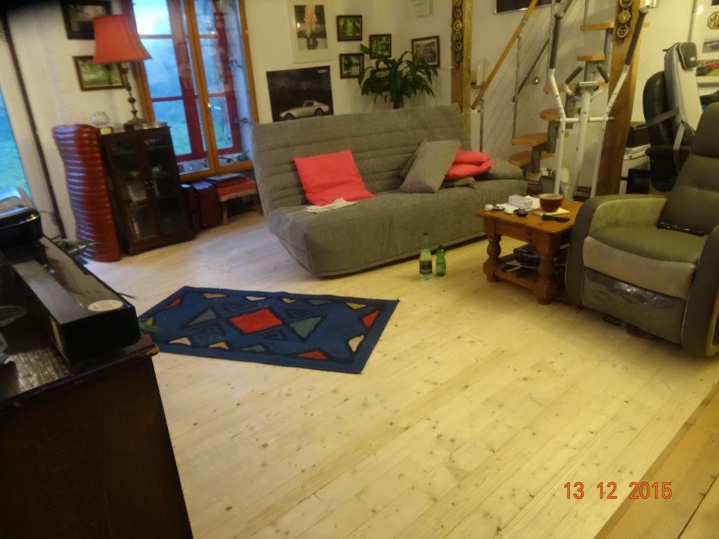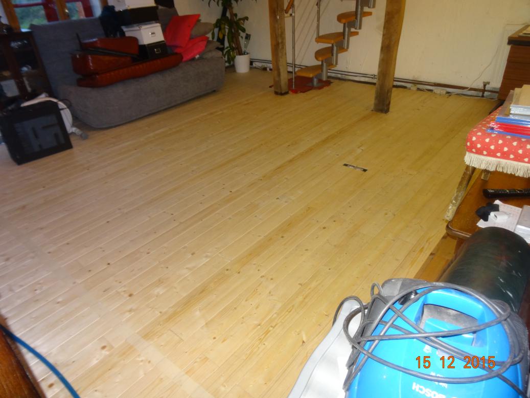 Started on the floor at 0700 and worked through until 1230. That effing gun! First the battery kept losing contact. I wedged more card in to hold it in. Then the end cap came off the (new) battery. I put it back on. Battery OK, now the gas cannister kept falling out. After several times refitting the cylinder and refitting the cap that is supposed to hold it in, I put a piece of card between the cannister and the body. I then gaffa taped the end cap to the body. Fixed. Well not really as the safety trigger now started playing up and I needed to push down hard to get it to fire. Not easy when your trying to hold a board in whilst firing a nail in. Lynne was helping me, mainly tapping the ends whilst I aligned teh T&G at the other end. After half hour lunch I carried on until 1730 when I was too tired to finish. We're out at Rennes Christmas market tomorrow (I do love mulled wine) so I'll finish on Sunday.