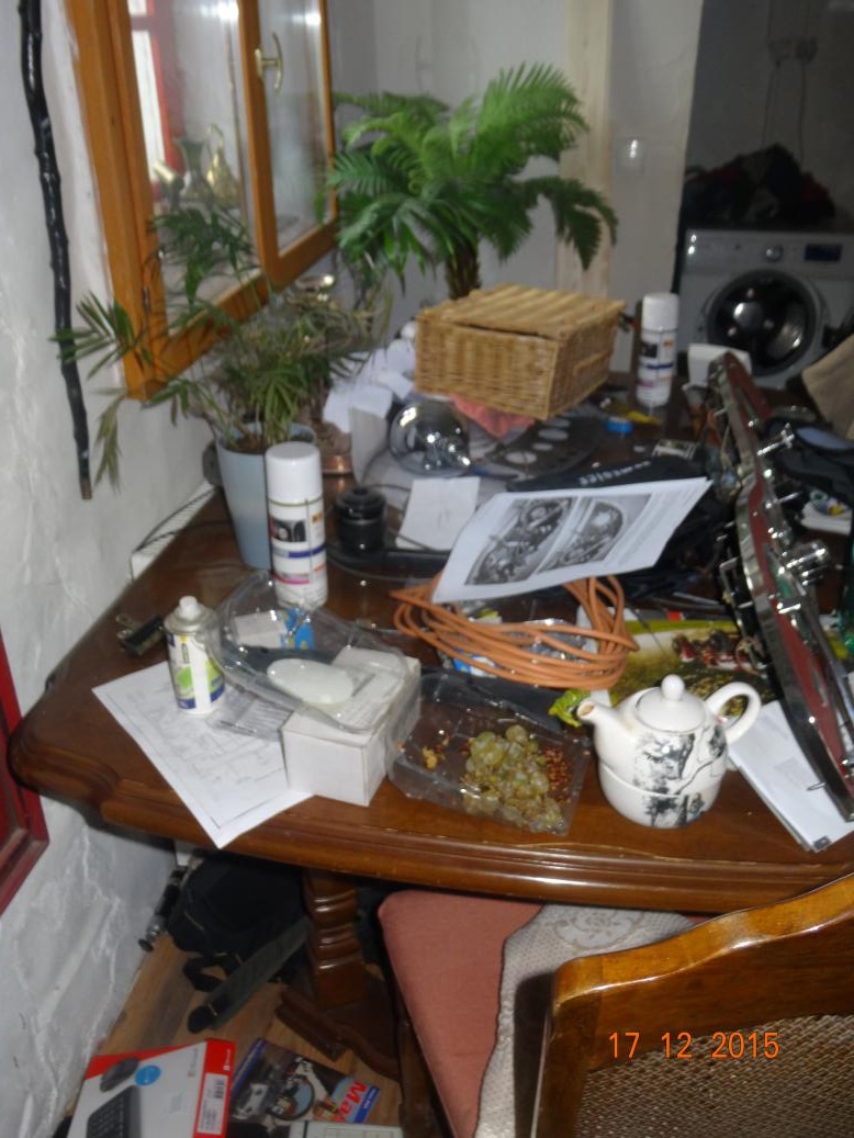 After lunch I applied the second coat (of silver) and carried on clearing out the garage. I put a thin third coat on the outside and carried on with the grand clearance. I went to move an old plastic tool box and found it was wedging a pile of Tomatz, hand made clay tiles worth about a Euro each. They fell on my foot. So I cleared a bit more and put the first coat on the insides. Went inside and asked where the casualty department was and are you a nurse. My foot was thoroughly examined, I was pronounced alive and a wadding held on with plaster tape was applied. I went back and put the second coat on. I then repaired the very long extension lead that the JCB man tore apart and plugged the battery charger on the telescope back in. Finally put a thin third coat on the insides. All the paint is now gone. Gone with the wind, I must stop eating beans!. I'll see if it's OK tomorrow and if not order another two tins. I turned the lights out and the heater off at 1830. The wheel wells seem to be dry. I've powdered them with some flour to make sure they are dry. The fact that Lynne had some flour is a miracle. She once won a bag of flour at the village hall raffle. As she didn't;TA know what to do with it she auctioned it off for the new village hall fund.