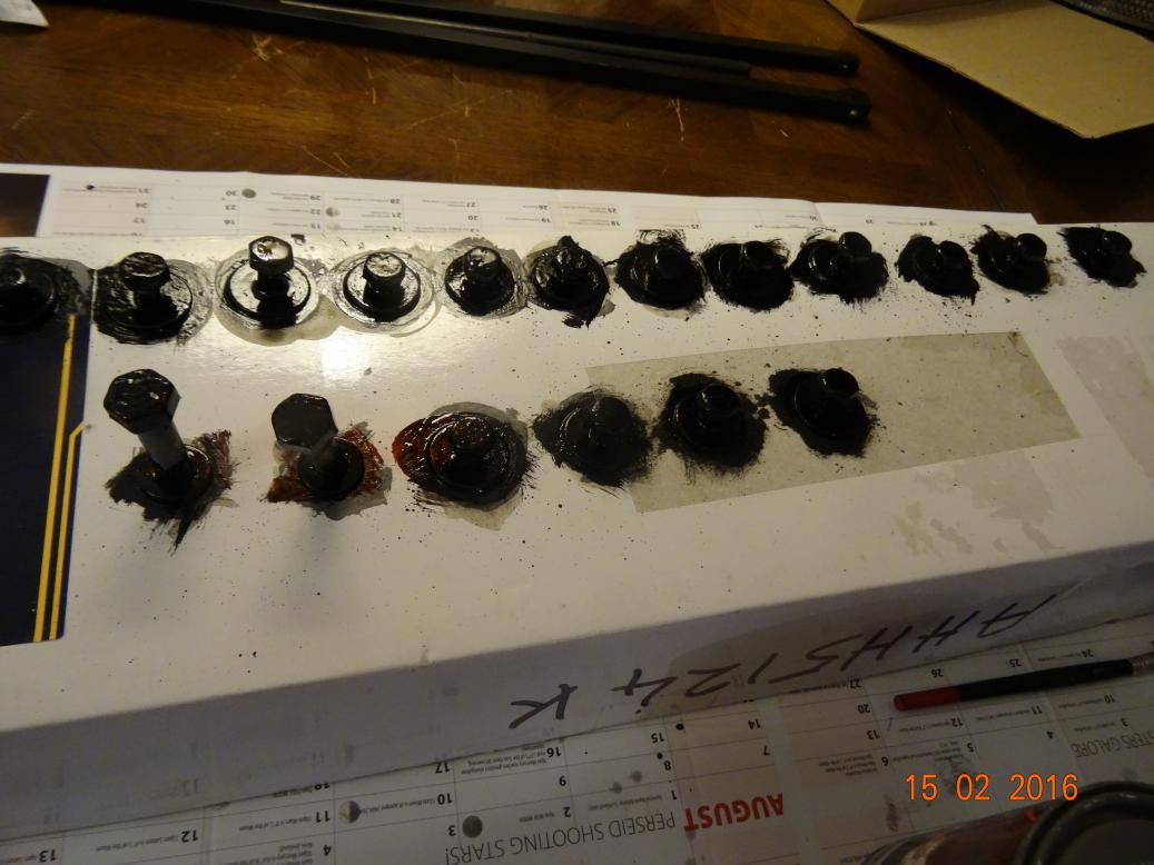 This is what I finished of last night. 20 bolts, de-rusted, primed and two top coats of shiny black gloss.