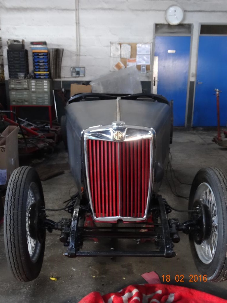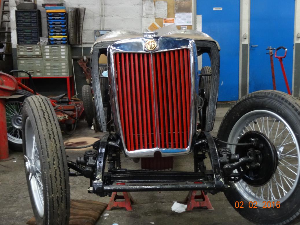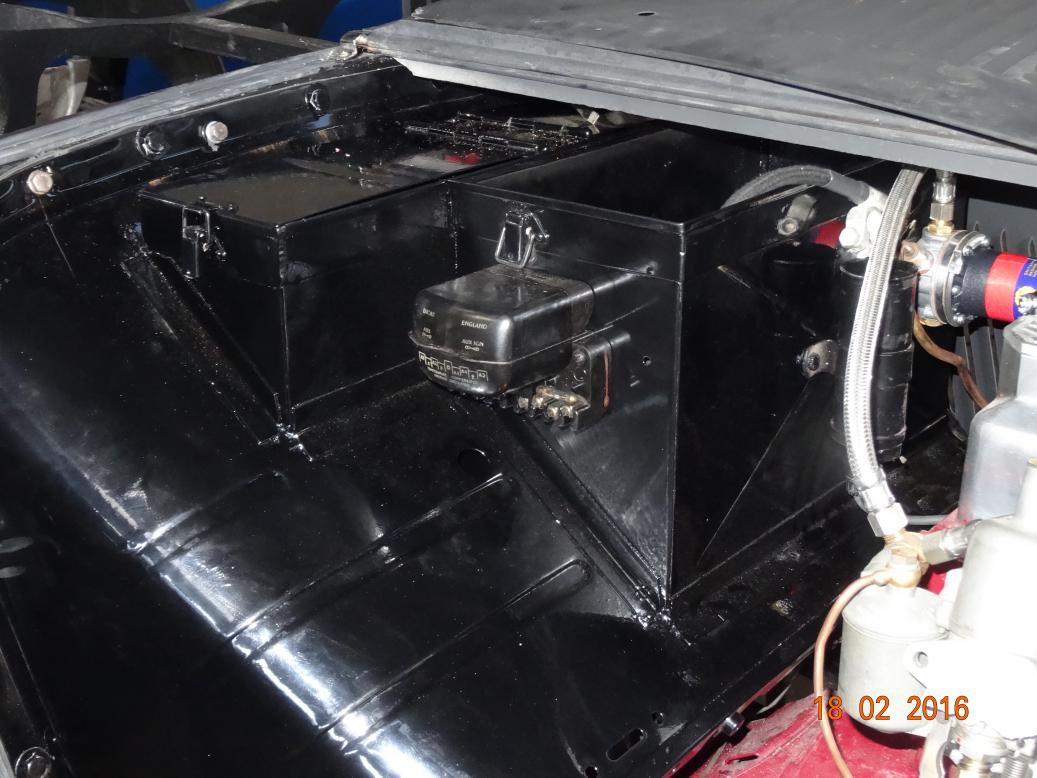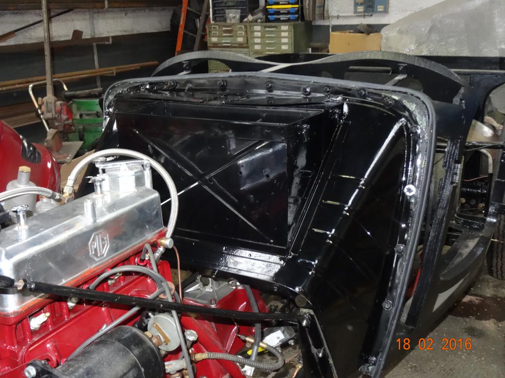 Physio at 0900, back by 1000. Changed and set off for the bodyshop. I got there at 1045 and glued the rubber strip for the rear edge of the bonnet to the frame and had a good look at the bonnet allignment. It will be OK when I refit it all and adjust the position. I then drilled the holes in the bearer at the rear of the tub and bolted the rear of the tub to the chassis. Bonnet off and wrapped in bubble wrap then removed the bulkhead. I treated the rear of the tub where I took the strip that goes over the back of the hood, with undercoat. I then decided to wait until 1700 so I could get a second coat on. Whilst I waited I greased the track rod ends and drag link.... no I didn't, because one of them has no grease nipple, must find out why. Then touched in. with black paint, the fan blades where I'd painted the tips yellow. I also painted the new chassis bolts. When I popped into my friends on Wednesday to collect my wood blocks I noticed the cup washers on his front engine mountings where upside down so told him. I thought I'd check mine as I didn't remember if they went on correctly. Just as well I did as they weren't fitted! I found them in a box, derusted them and fitted them. I painted the underside before fitting and top side after. I was lucky as I could jack the engine just about high enough to get the N/S bolt high enough to get the washer in without having to remove the dynamo. Lastly I fitted the clutch and brake switch springs. Final coat of undercoat to the strip on the tub and home... well not quite yet, battery flat as I'd left the ignition on, with the headlights on, whilst I worked from the tools which I'd packed in the boot to bring home. I used the battery pack to start it, filled it with petrol and away. Jean-Maurice, the panel beater and painter had started painting the bulkhead in the spray booth. I think he will get the undercoat on tonight and top coats Monday week (they're closed next week). He says I can refit it on the Tuesday.