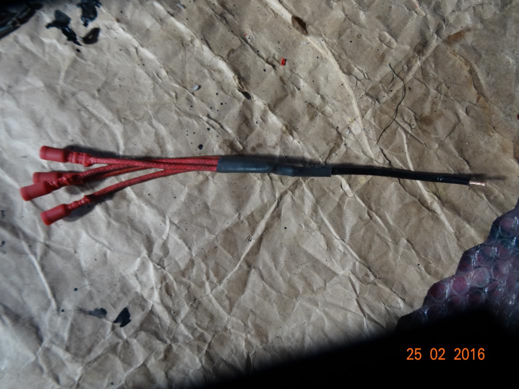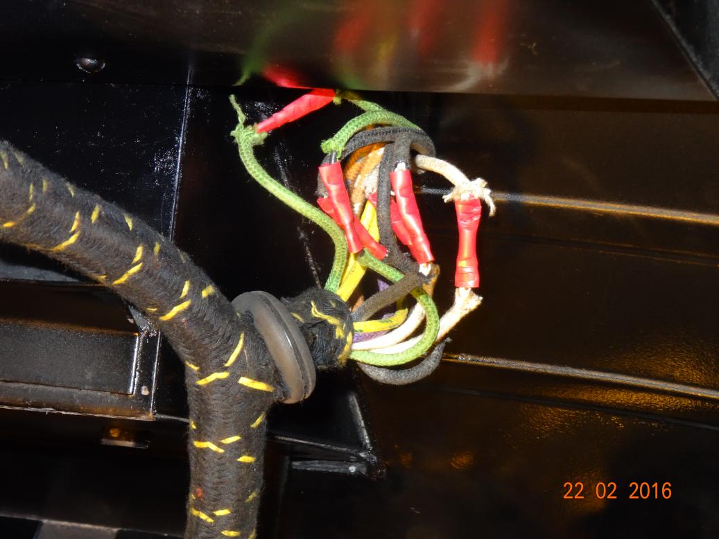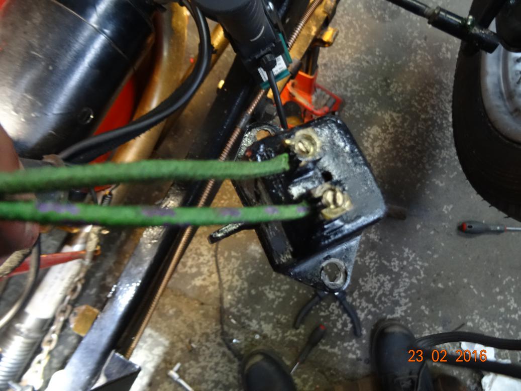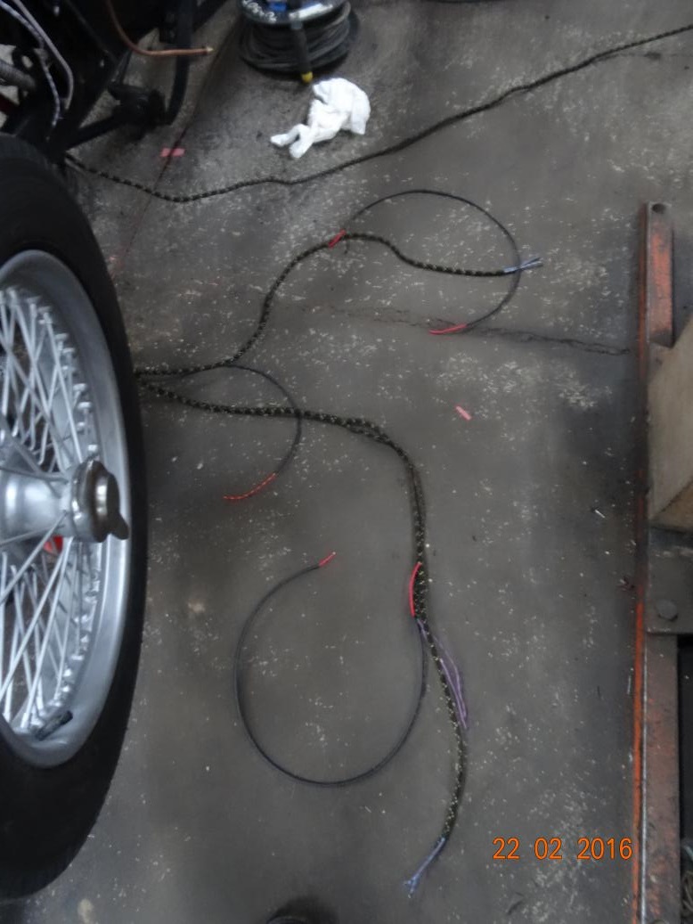 The first wire of the loom to be fitted, the brown main feed. You can just see the two green wires hanging down by the brake switch.