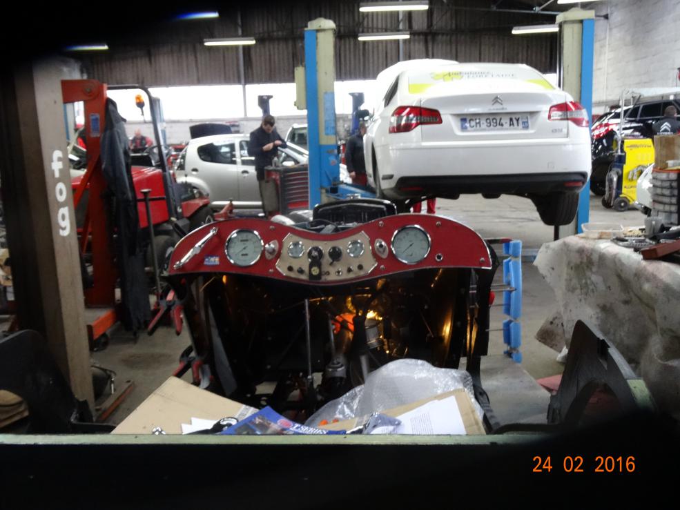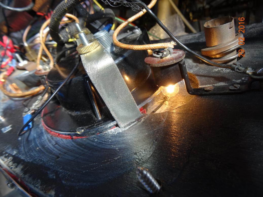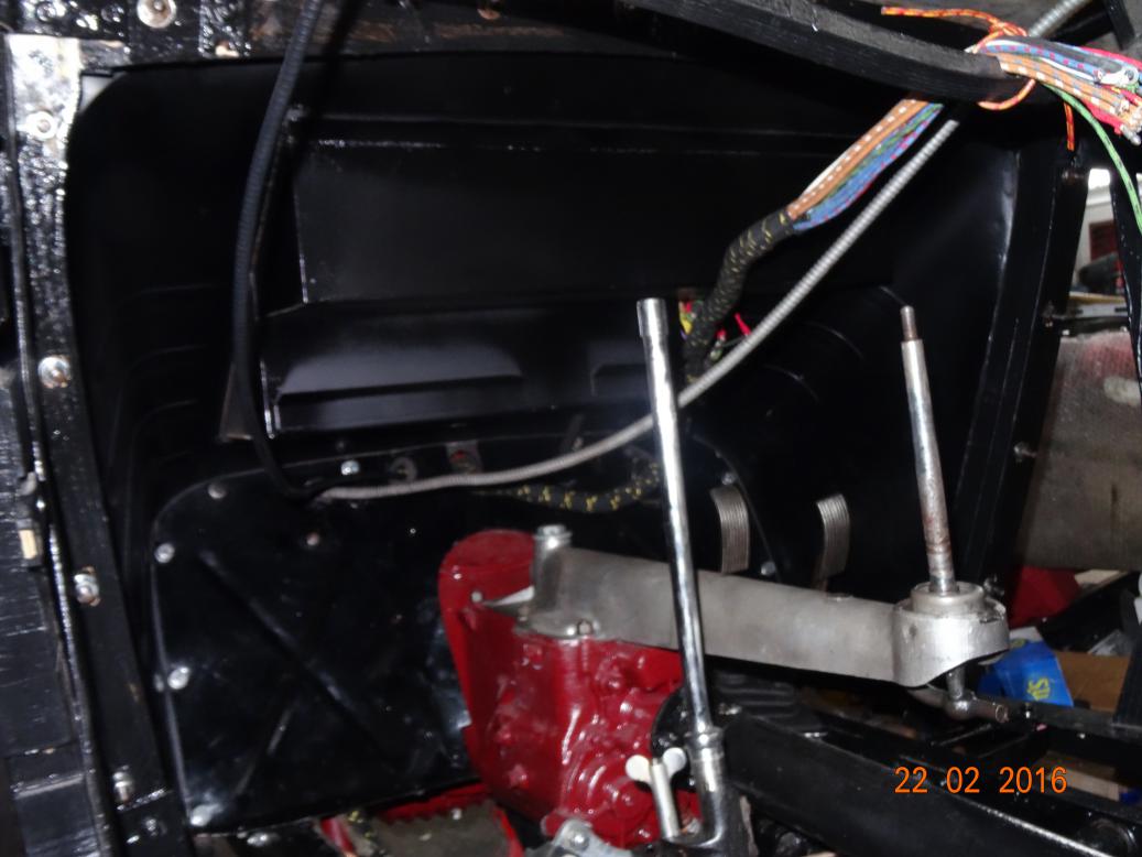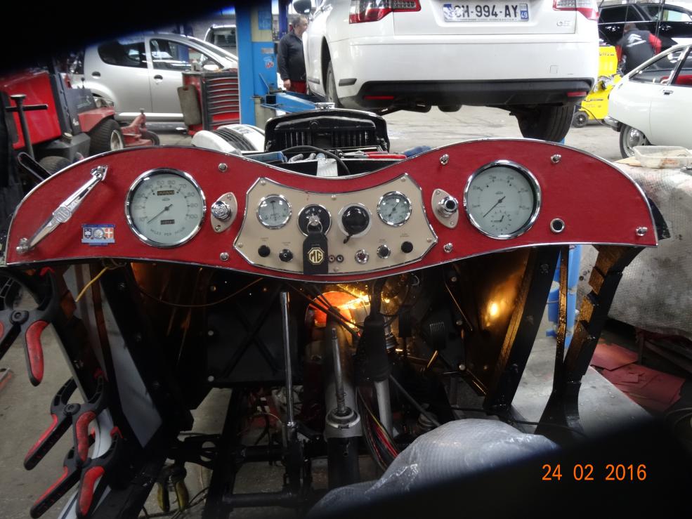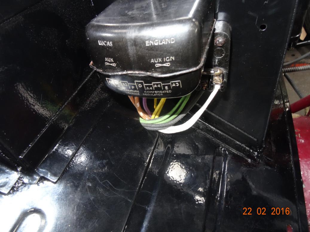 So, what did the plonker do today.... not a lot it seems. First job was to fit the two wires to the brake light switch. Time traken 2 hours! Why? Well the two grub screws were very tight so I decided to take the switch off and free the screws off. Problem was the screws that hold the switch to the bracket were rusted and covered in POR 15 paint. One came off, the other had to be cut off. I freed off the screws and refitted the switch with new screws and nuts. Then the edge of one of the grub screws broke away. I cut a deeper slot with a junior hacksaw and fitted it all back. I also adjusted the brake pedal and can see why the pedal is returning too far. I've put the Thackery washer at the wrong end of the shaft so the pedal is not coming to stop on the stop lug. It's a bit of a job getting the shaft out of the pedal cage with the body on so I'll extend the stop quarter inch. Next was to fit the coil and petrol pump wires, no problems about 10 minutes. It was taking longer than it should because my fingers were frozen and I was trying not to drop any small nuts. Then the dynamo wires. Problem here was the larger of the two nuts was missing and I spent about half hour trying to find a nut that fitted. When I did it took a could of minutes to fit the two wires.... after I had wrapped the loom in tape and pulled it through the chassis. Lunch, my everloving made me lovely cheese and salad sandwiches. After lunch I bared all... well stripped all the wires going to the dash, then I started on the dash. The dash has been sitting on my table at home for months waiting for me to finalise the wiring. Never got around to it. So I fitted all the earth wires and a few others but had a problem. I couldn't work out why the dash bulbs wiring wouldn't reach all three bulbs on the tacho side. I tried it every way I could think but one end was always short of the bulb holder. I then looked at the pictures I took when I first took the dash out. The centre bulb holder, the one for the oil pressure gauge is on the opposite side to the original. This is the new center panel I bought from Barry Walker. No problem, I extended the wiring. At this point Jean-Maurice starts fitting all the side panels and points out a plonkerism.... more later. Next problem is the wire that goes to the speedo for the 30 MPH light is terminating by the Fuel lamp. I'm not sure what's happened here, I'll check that the warning lamps are in the corect place. I've also got a problem with the new 30 MPH lamp and map lamp,, they are not earthed and have the wrong colour wiring. I'll sort it out, probably drill very small holes in the casings and earth the body that way. Last thing I did was to connect the battery to the dash lights. Some work some don't. The bulb on one that doesn't work seems OK. I'll order new bulbs for the whole dash, it's easy to fit them whilst the dash is out. OK, today's plonkerism, well actually it was last week. When I packed the body up to get a good fit on the front of the bonnet to the rad casing edge I only packed the front four bolts. I read somewhere it was OK to have the body slope slightly so I didn't pack the two rear monunting. Jean-Maurice pointed out the body is split by the door hinge on the passengers side!. I filled the gap with glue, undid the two rear bolts, jacked the body and slid the three pieces of lino tiles between body and chassis. The gap closed. I then tightened the body fixing bolts. I drilled a small hole through the hinge piller and fitted a wood screw in to hold the split together. It's OK.