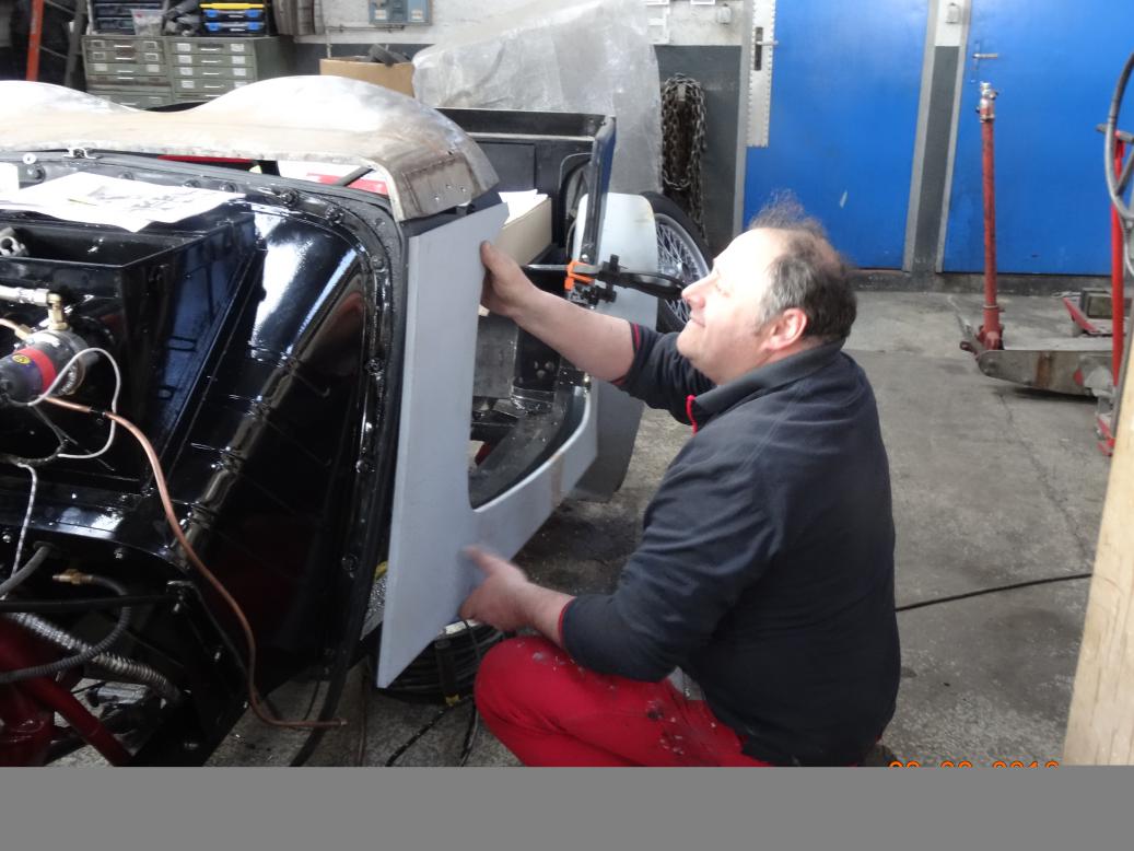 Jean-Maurice fitting the side panels. I'm not sure if the panels or the tub are wrong but he had to make a new fold as it overlapped the front edge of the door too much. Note the repair to the side of the scuttle. He's welded in patches either side where the scuttle panel had all but rotted away where the windscreen stantion fits. I rubbed my fingers across the seam and couldn't feel a thing. You can also see the clamp holding the split piller together and the screw that I've put in.