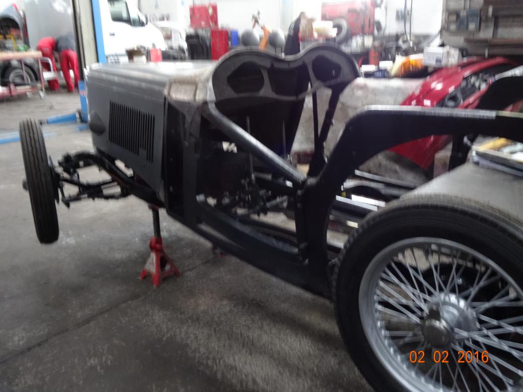 Arrived at the bodyshop at 0800. The bulkhead was painted but he hadn't painted the foot board yet. I glued the rubber strips for the bulkhead in position, put some screws in the bonnet rubber did a few other bits and pieces (which I can't now remember, welcome to my world.... now, what was I saying?). About 1100 Jean-Maurice and I lifted the bulkhead on and I then set about bolting it up. I got all the top and side bolts in except for the bottom three each side. These six bolts were very difficult to get in as the side of the bulkhead needed pressing in to align the holes. Took a while but I got there in the end. Then for the six bolts, three each side, that go to the uprights. These were even more difficult to line up and get in. After an hour or so I had all six in. I then tightened all the bolts to the body and then realised that I'd have to take the six that went into the uprights out again as they go through the toe board, which isn't fitted yet. Never mind, it will be easier second time around. I always say that and it never is! Then we lifted the bonnet on. I put three pieces of lino tiles under the 4 front body bolts to raise the body in order to align the bonnet. I also had to pack out one side of the radiator mounting as the rad was leaning over. All in all this took about two hours but it's all looking good and aligned now. It was now 1650, I was freezing cold, and totally knackered (a permenant state with me these days). The very nice lady in the garage made me a coffee and a biscuit and after that I left for home. Got in and backed into the garage. Being an optomist I put the battery and a few more spanners in the boot for tomorrow. The worst job today? Feeding the battery cable through the battery box whilst trying to keep the grommet in position and stop the cotton braiding being held above the grommet. Did it the end with a piece of rubber tubing acting as a sleeve. Got the same to do tomorrow as it also goes through the foot board. Oh what fun!