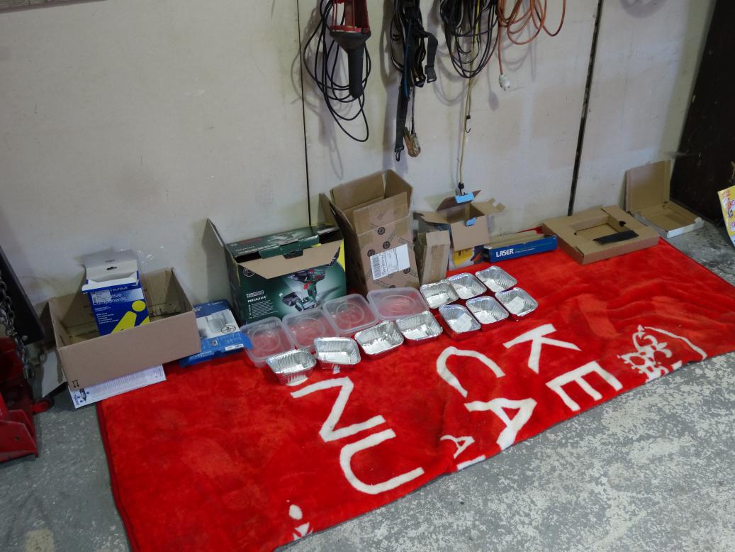 More preparation for the TC. The workshop has been swept (can't do much about the oil stains). The stuff on the back wall will be moved and a big red blanket laid down for all the parts to be boxed and bagged when they come off.