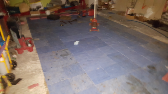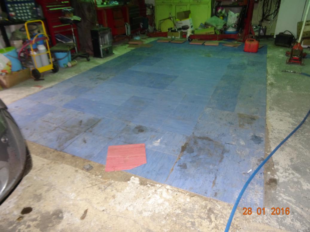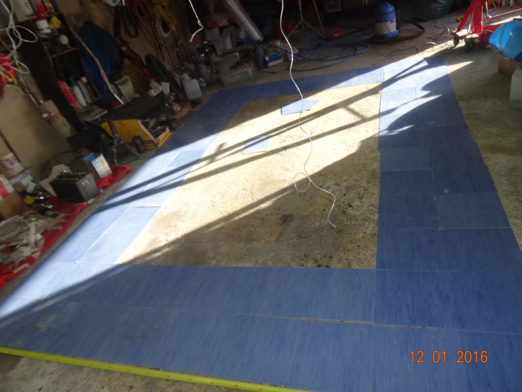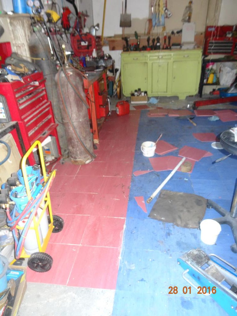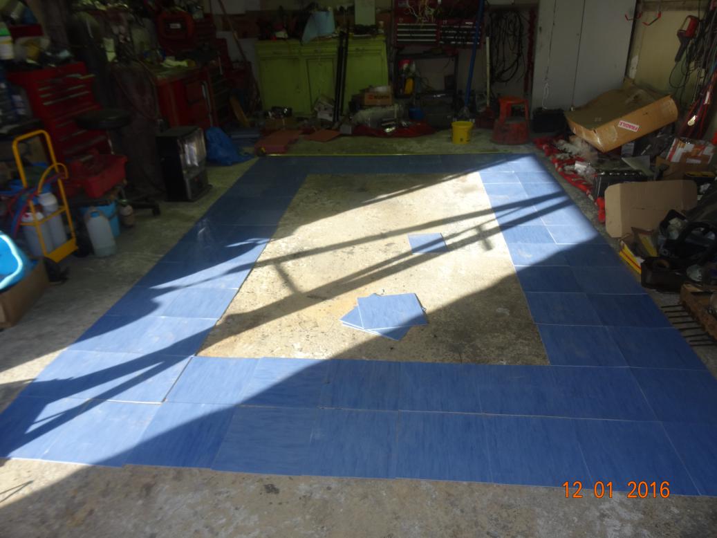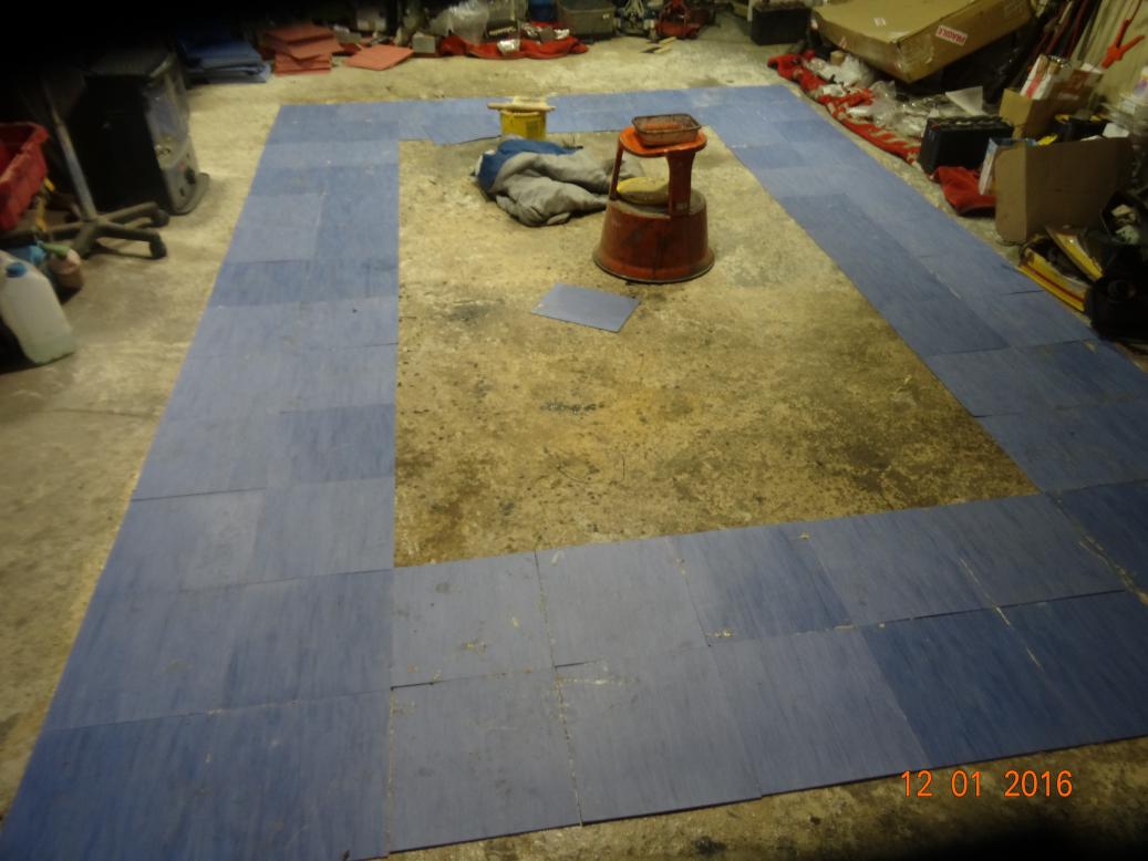 The floor at close of play, this is now stuck down. I hope all the glue I've got on the top will come off, should do..... I hope. Tomorrow, after physio, I'll lay the red tiles in the centre. Then more blue at the front and the remaining red around the bench and tool boxes.