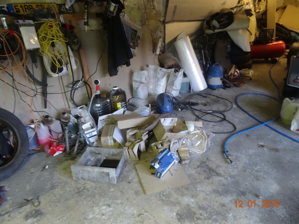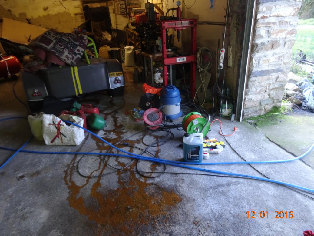 More floor, needs a sort out. Note the new extension reel, the old one, now 15 years old is getting past it. The brown stain is the rusty water I drained out the compressor.