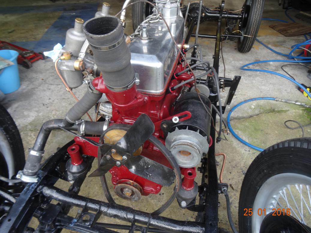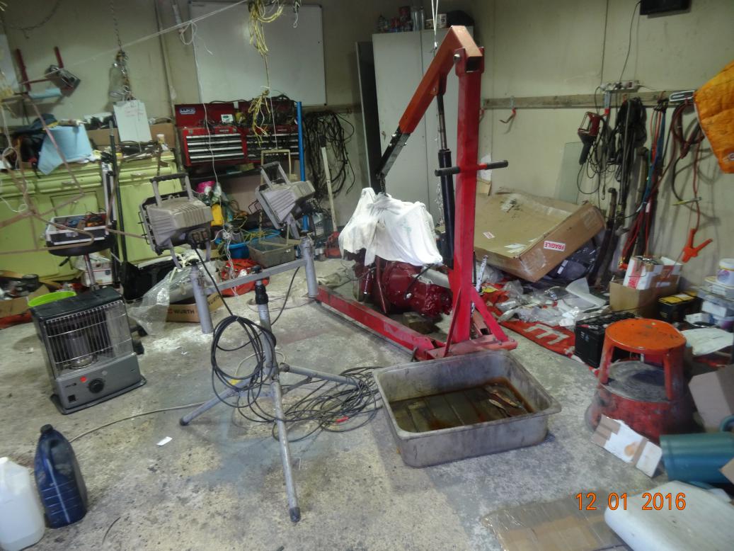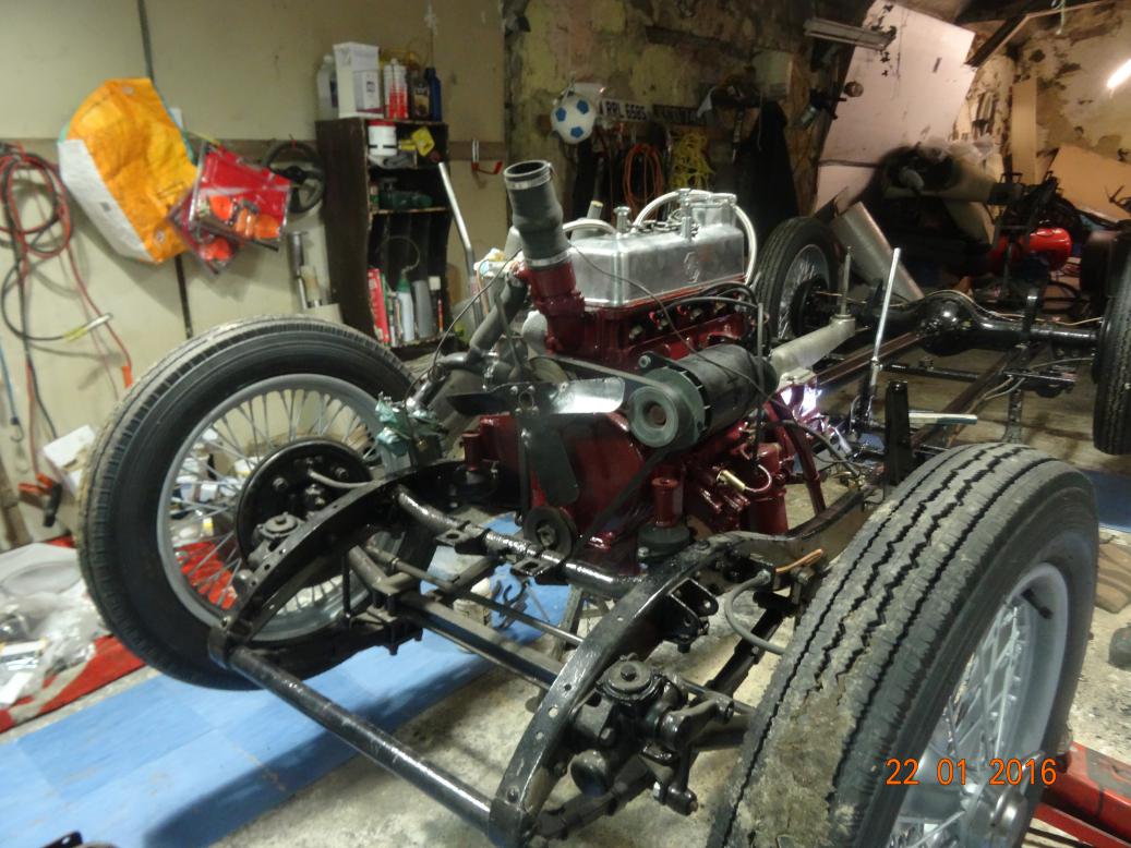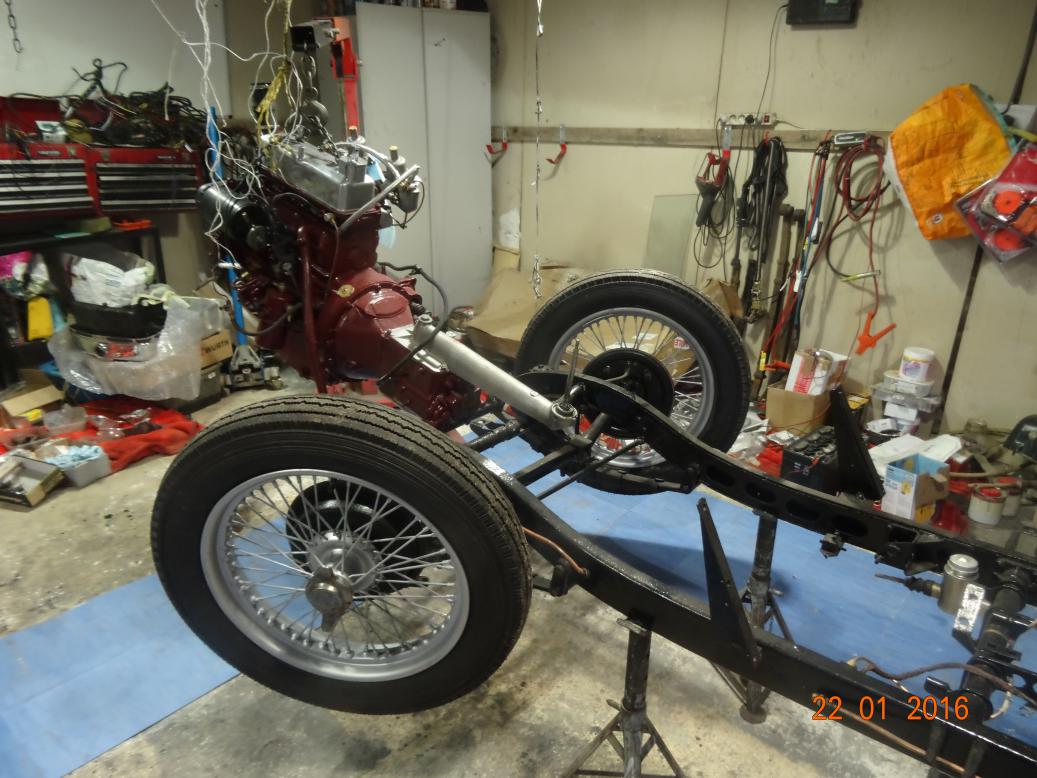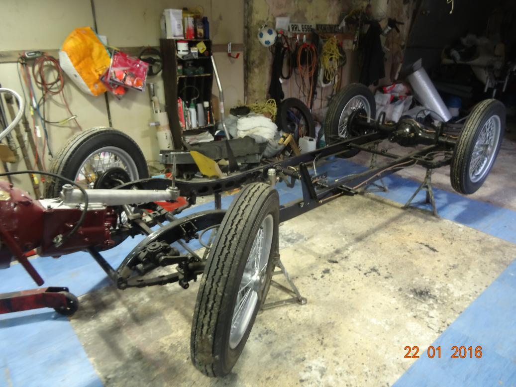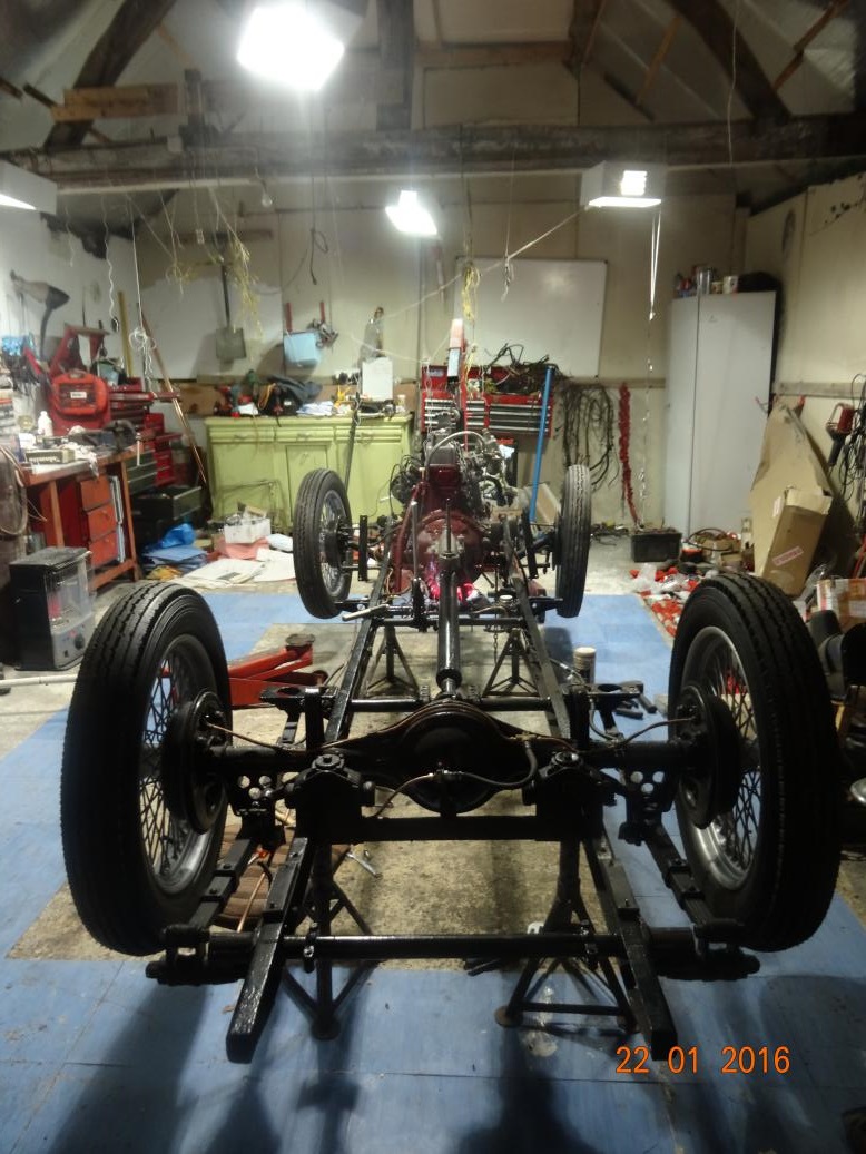 Chassis in the workshop, up on stands,with engine in place to refit.