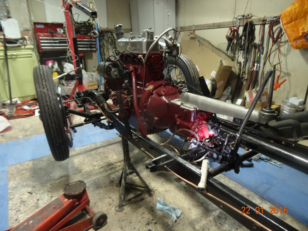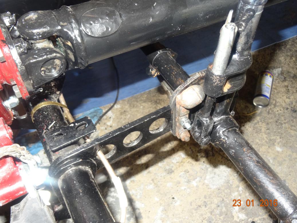 You've all been there. It's 0530 and you're wide awake but it's too early to get up. So I read another few pages of The Lord Of The Ring and..... wake up at 0910. In the workshop by 1000. Clear the bench and floor area and lay out all the boxes and cabinets of fixings. Then get the chassis lined up ready for the engine to go on. First I spend some time finishing the handbrake and fitting it. Then the pedals go in. Lastly the engine and gearbox assembly goes in. Only problem is the rear plate on the gearbox is stopping the gearbox mounting bolt going through. Soleved it by running a drill through and grinding a flat off one of the bolts. Then the prospshaft goes in.