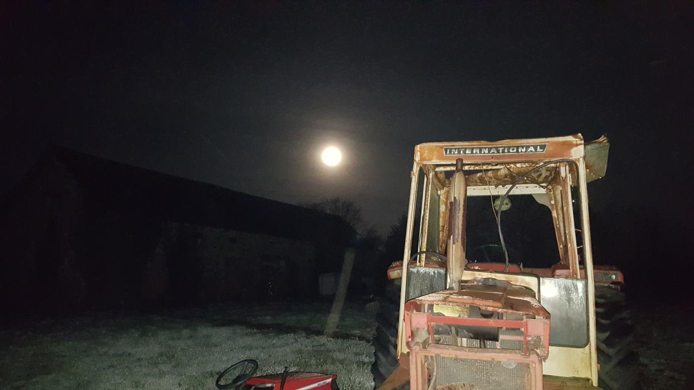 I took this picture with my phone the other day when I was out early. The tractor is lit by the flash but the moon is lit by the sun. There endeth the science lesson. Bright moon.