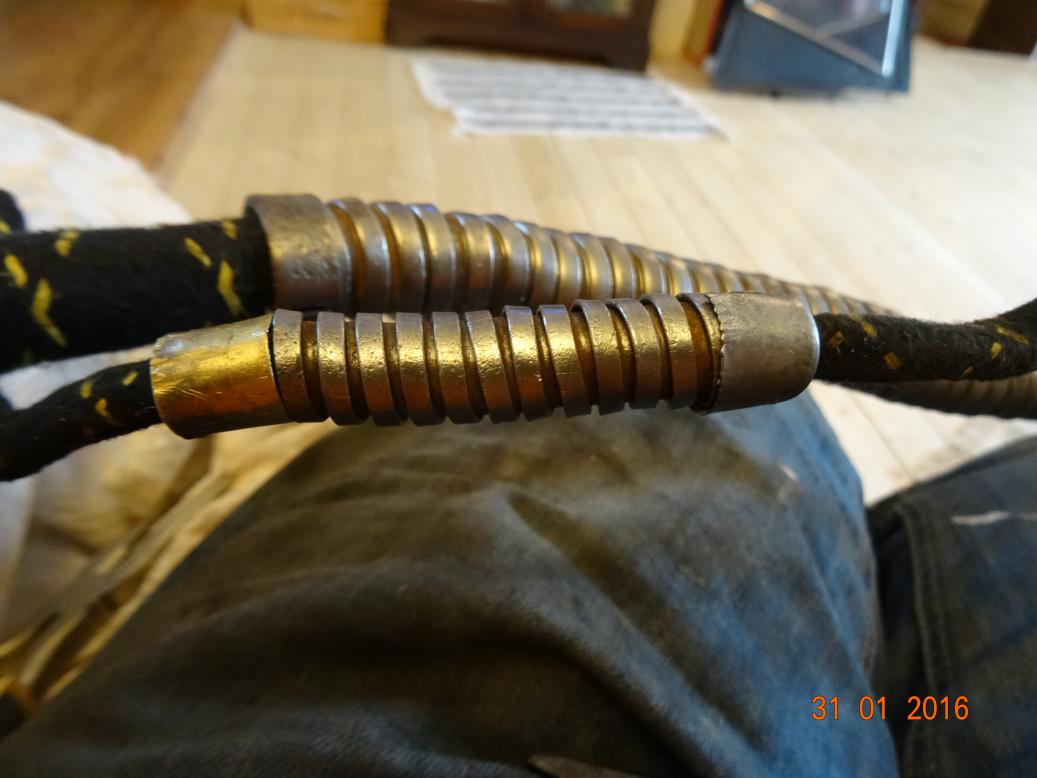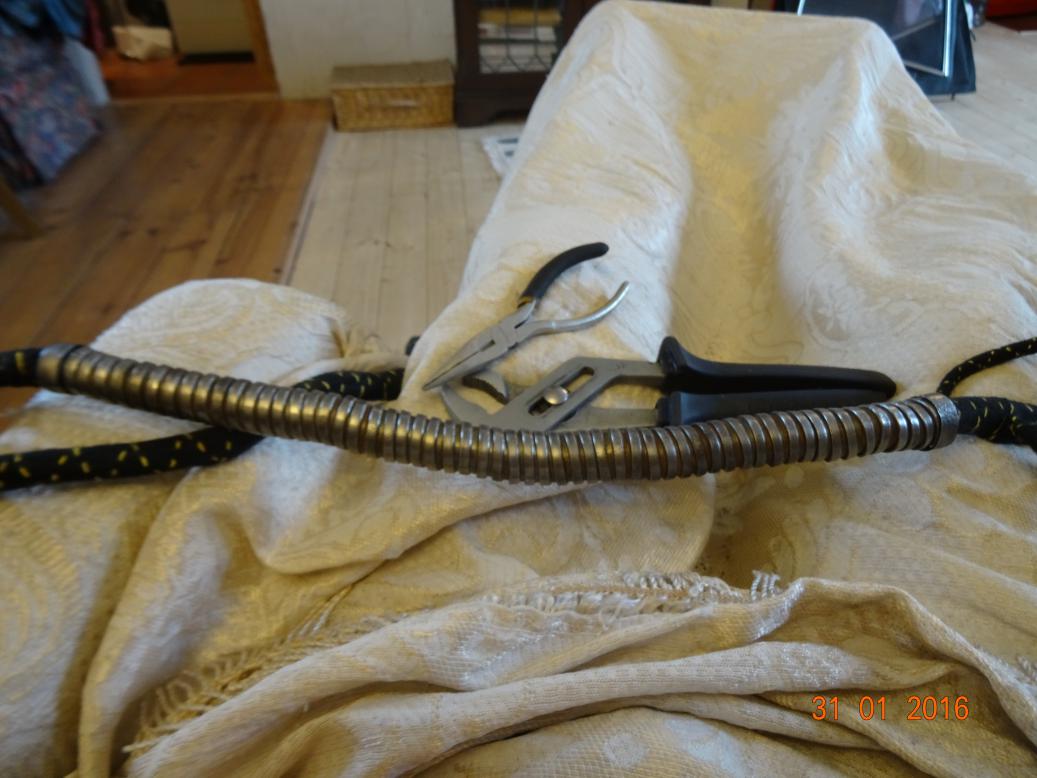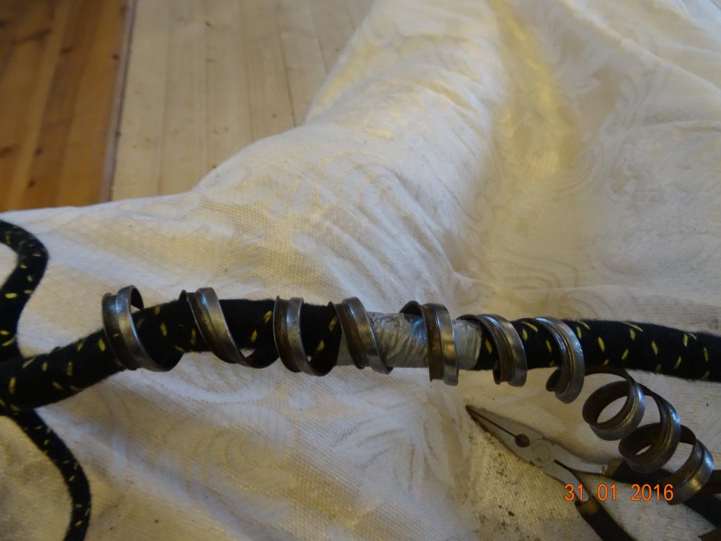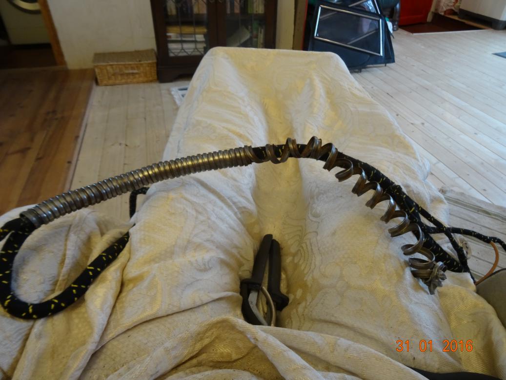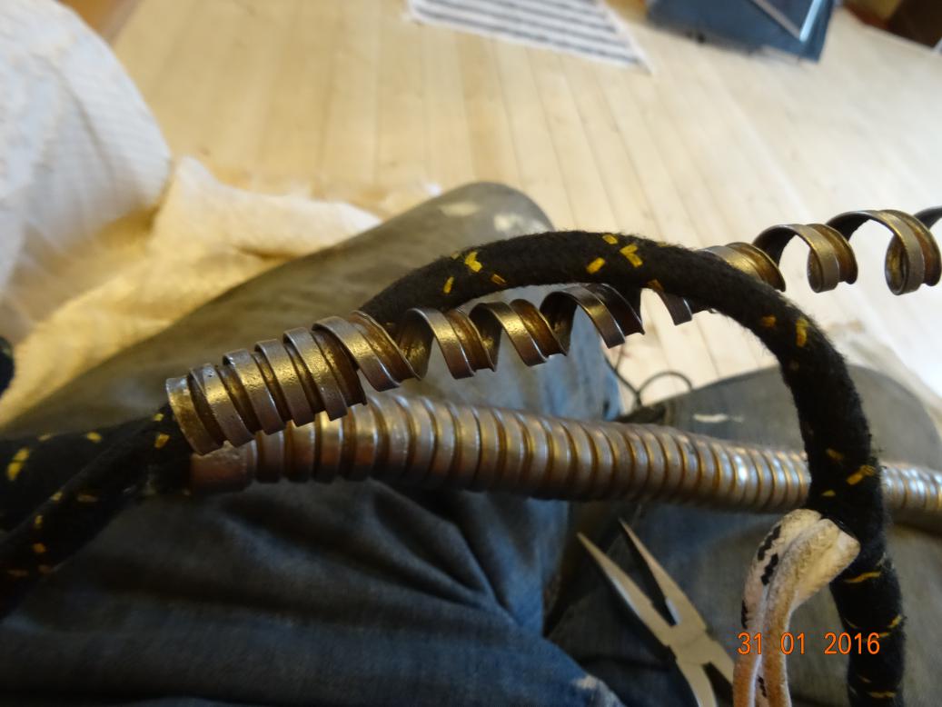 Got the old loom laid out and the new one in the same orentation. Then marked with a piece of tape where the armour should go on the new loom. I cut the old loom to get the armour off and then cleaned it on the wire brush. I cut the ferrules so that will fit over the new loom, the intention is to solder the cut joint. Then I unwound the armour coil. Took the ends, coil and tools inside. Sat in my chair with a cover over me, I proceeded to wind the armour on to the new loom. Having done a few turns I realised I had started at the wrong end and was winding it on with the next bit going under the previous. So I unwound it and started at the other end, with the next coil winding over the previous. It was very hard to do with my artheritic fingers but but got there by 1245. Put the ferrules on and pinched them together, I'll solder them in the morning. Lunch and then I cut the smaller section armour off the old, cleaned it, and onto the new. All done by 1445.