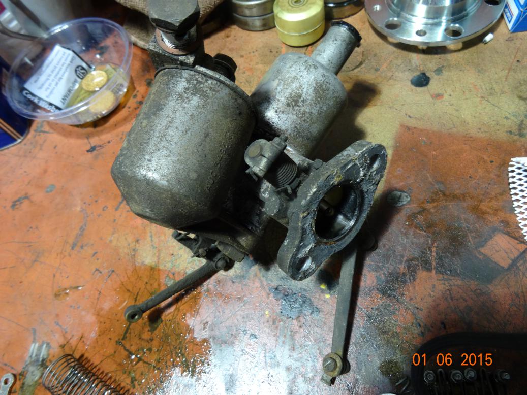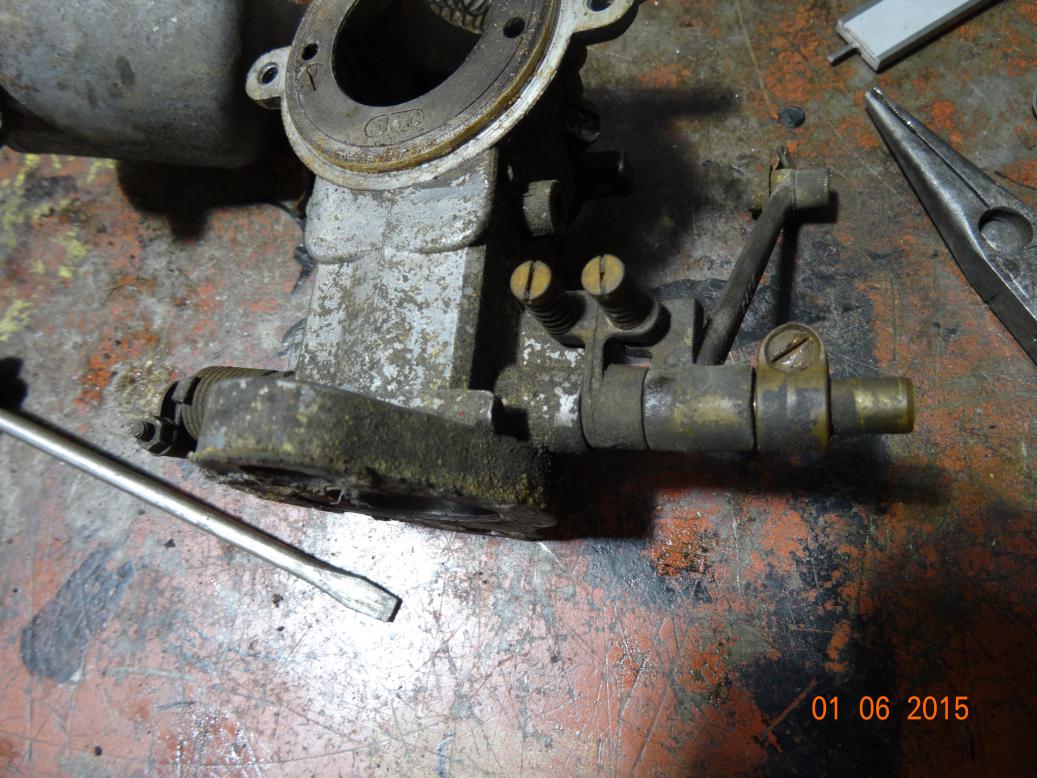 The, hang on, got to work it out, (hangs head to the right, then to the left) Ah, OK, it's the left carb. In bits but cleaned. The bolt that holds the float chamber to the body is missing so I've ordered one from Moss Paris.