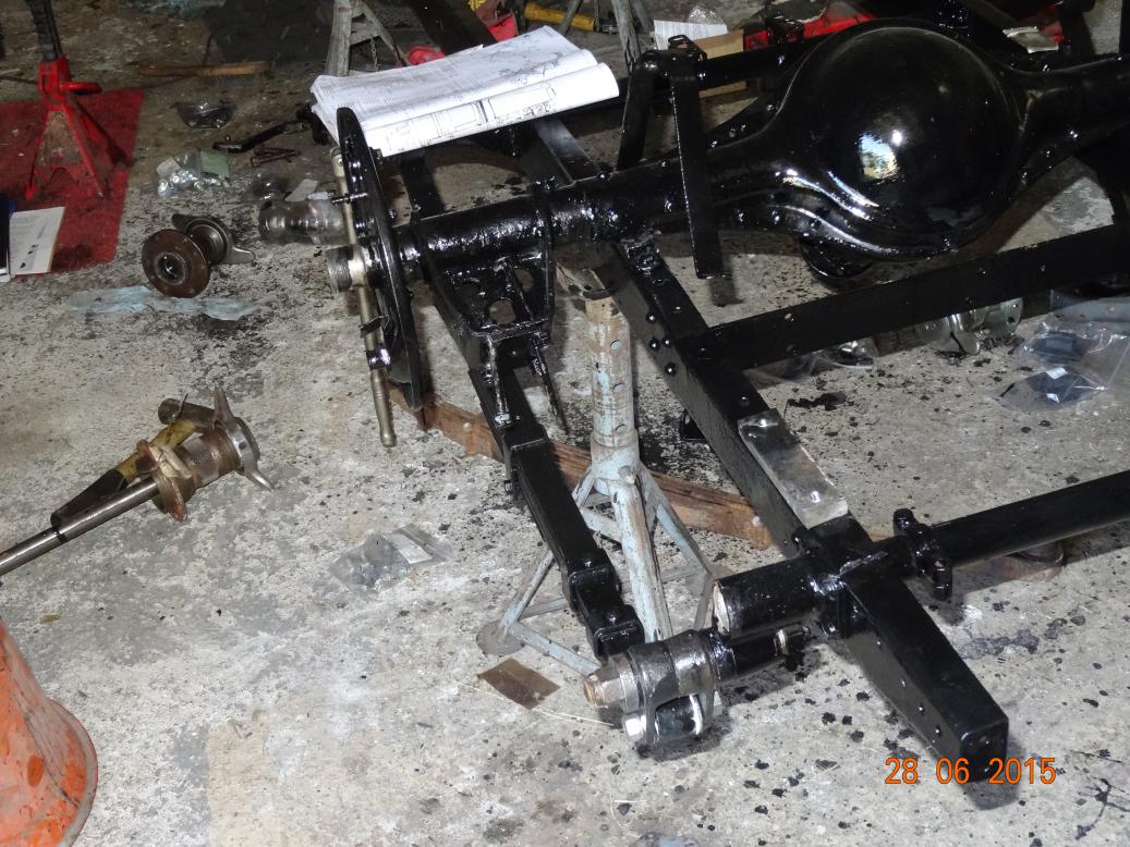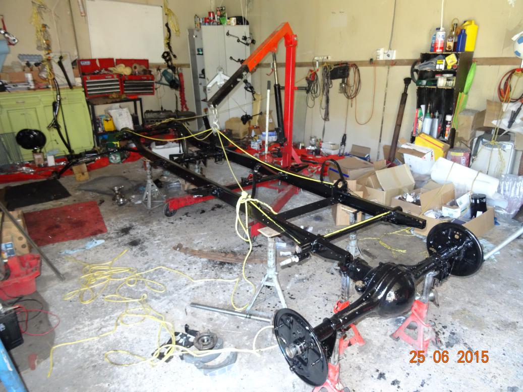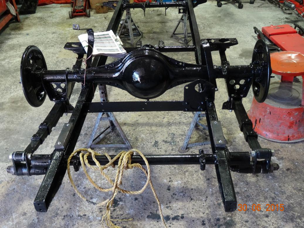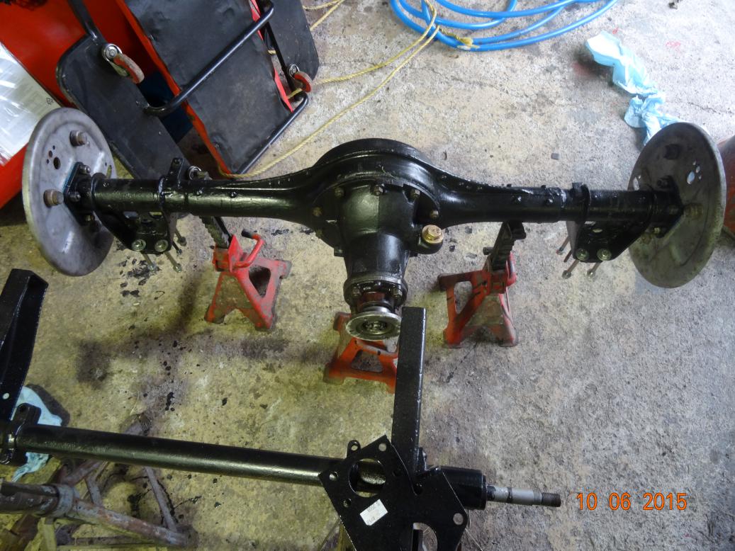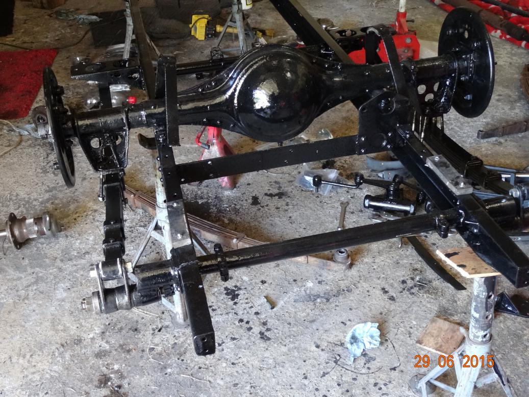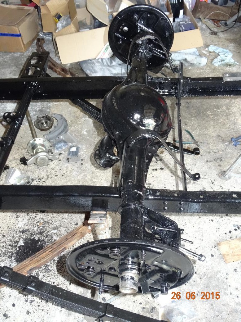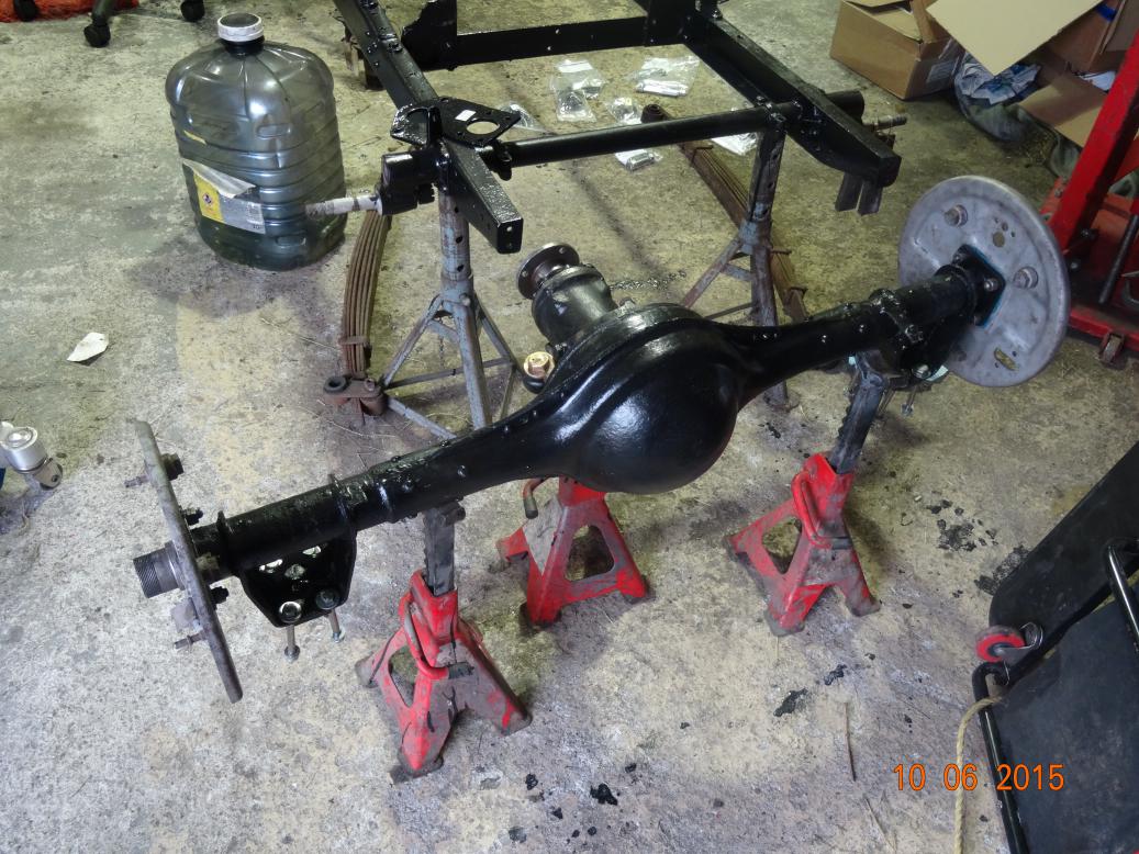 Rear axle on. A couple of days when I'm back (and it's cooler) should see the brakes and hubs on and the chassis rolling. Then I must get the paint and rust of all the panels ready for painting.