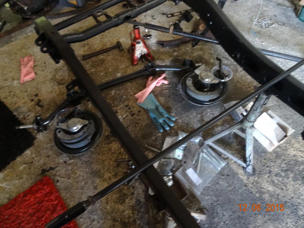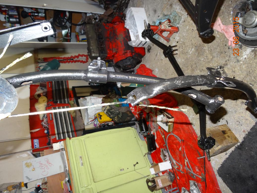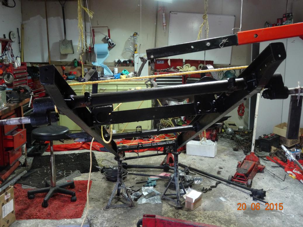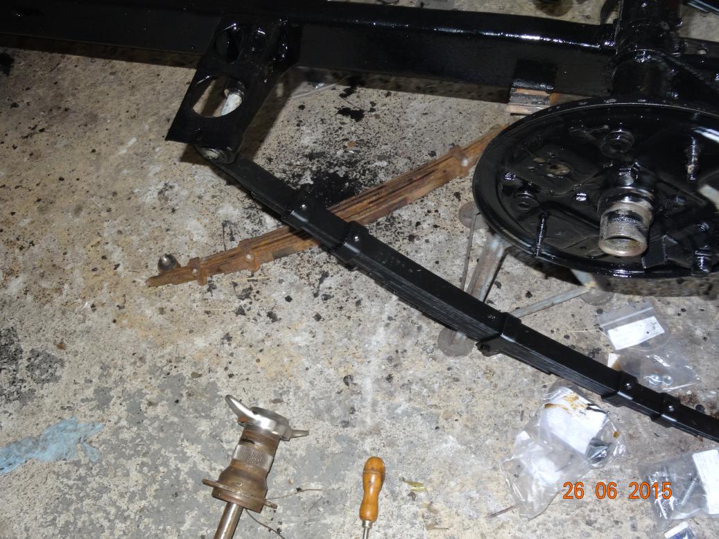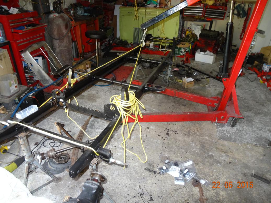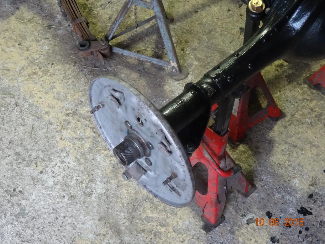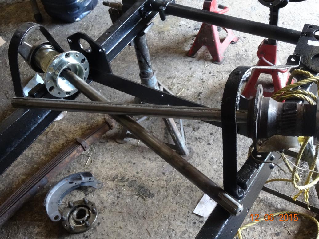 Rear axle on. A couple of days when I'm back (and it's cooler) should see the brakes and hubs on and the chassis rolling. Then I must get the paint and rust of all the panels ready for painting.