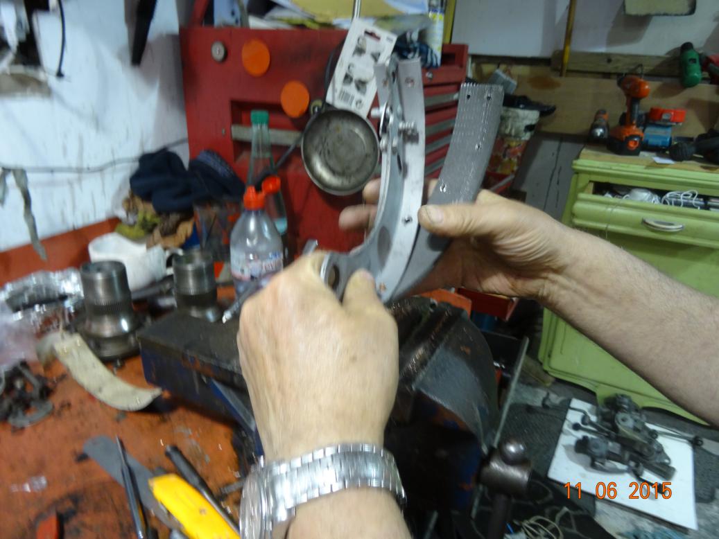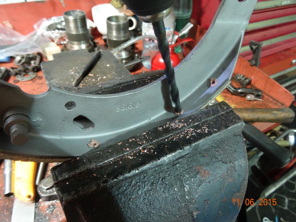 Started by pressing the half shaft out of the wrong hub. Took 8 ton to get it out. Went with a huge crack and the shaft hit the floor and bounced. I then fitted the wrong end in the new hub so had to take it off and fit to the other end. Went to 7 ton to get it in, really tight. Then started on the brake shoes. Spent two hours sandblasting them. Lynne helped and we got the old ones drilled out and new linings on with the new rivets. Photos below so I won't waste time describing it. After finishing the shoes I started on the brake drums. They're a nightmare, so I've left them in a bucket of rust remover. Looks like I'll just have to clean them as best as I can then paint them.