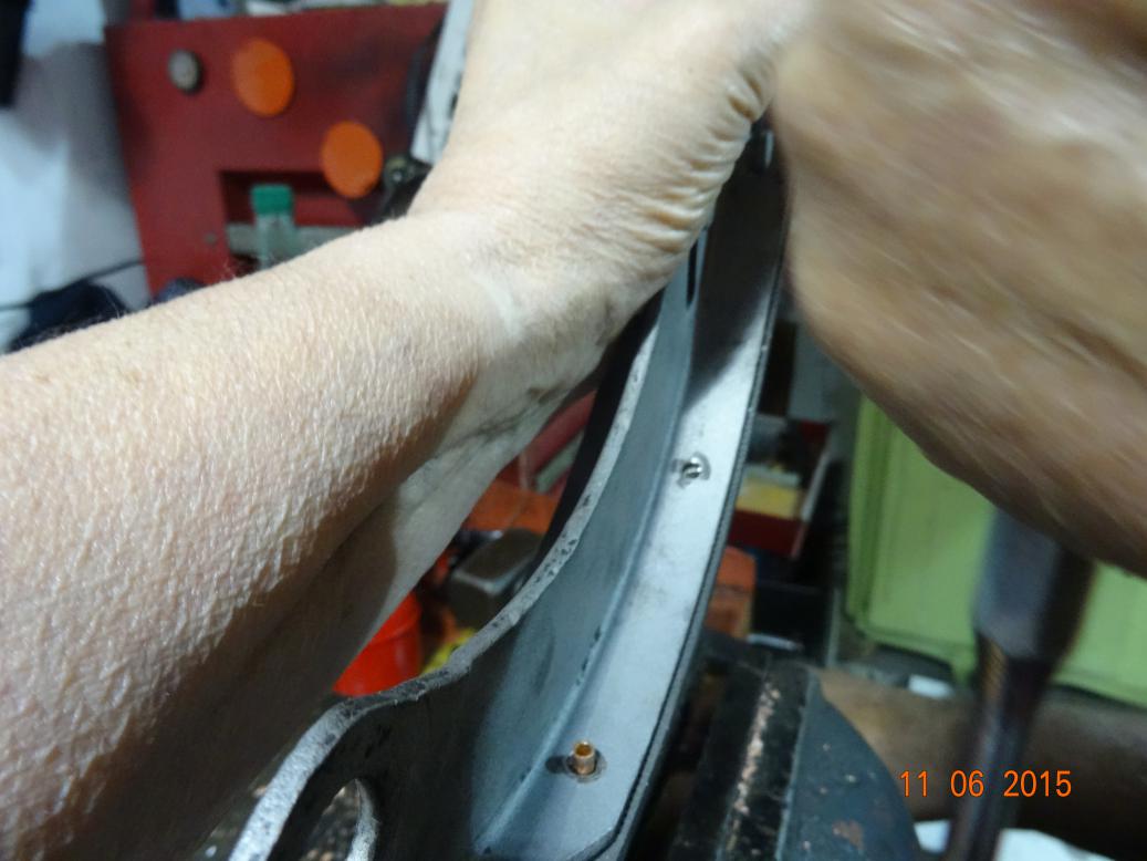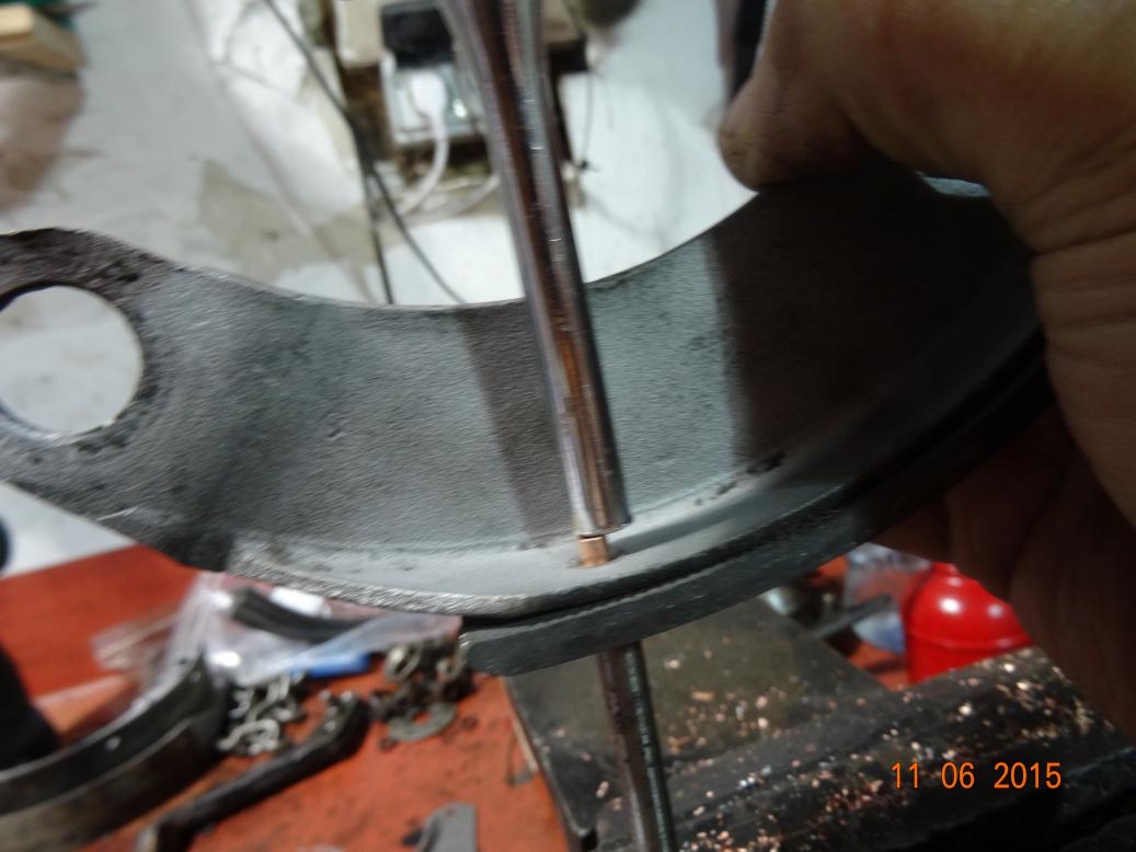 The old shoe having been removed by drilling and punching out the old rivet the new shoe has a new rivet inserted.