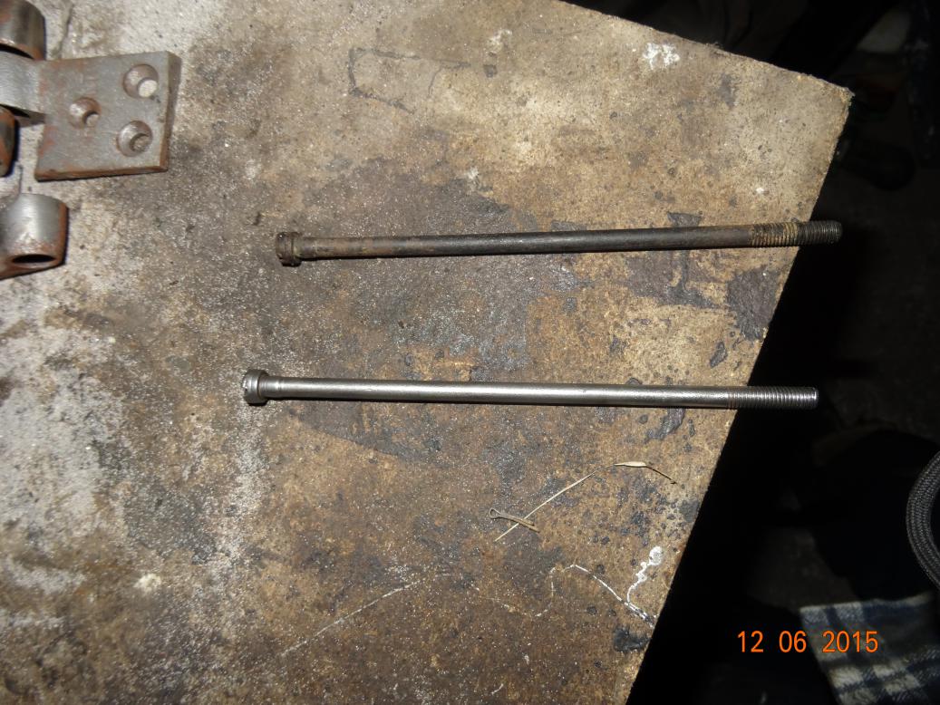 The 4 bolts that gave me grief. Notice one new bolt is longer than the others. I wonder if that's by design. It's still not long enough to pull the spring up to the axle. It may have helped if the bottom bump stops had been removed.