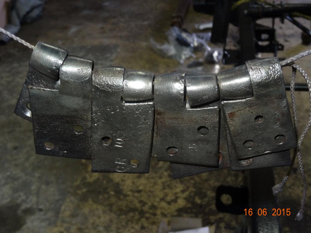 The old shoes. Apart from one, which was worn down to the rivets (but noit enough to damage the drum) they were all OK. They were 1960s technology, the new shoes are 21st century.