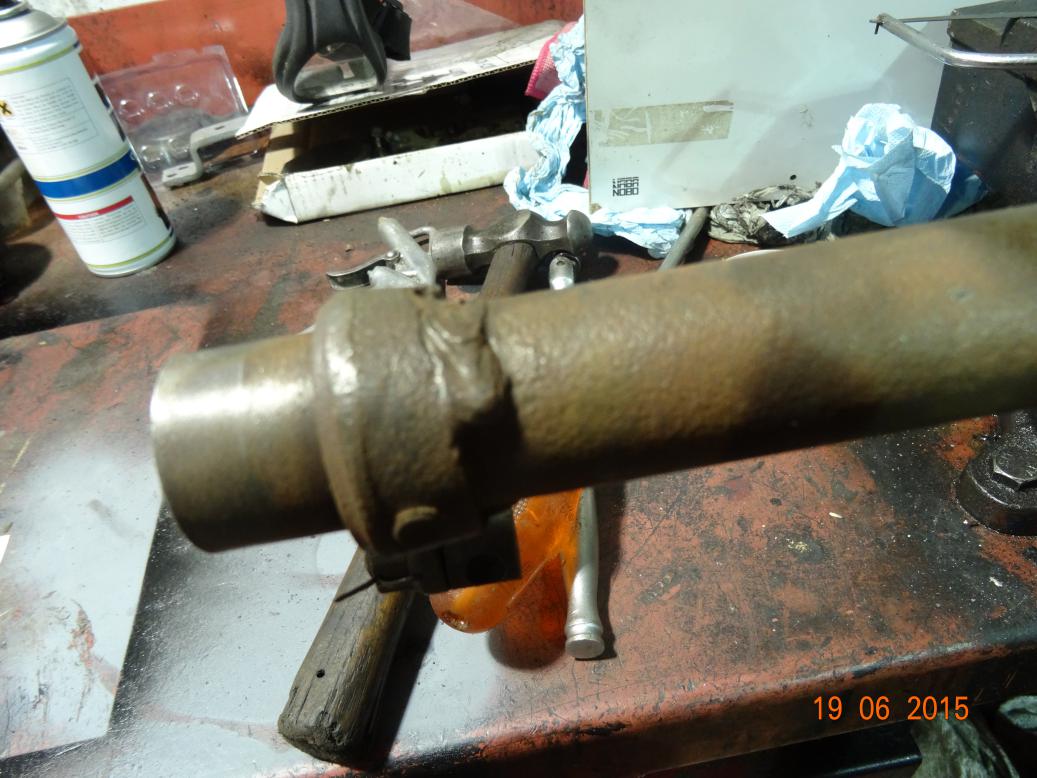 5) Hold the bent arm in a drill press vice. Using a socket on the arm use the press to push the arm onto the rod. The bush will slide further into the arm as the rod pushes through.