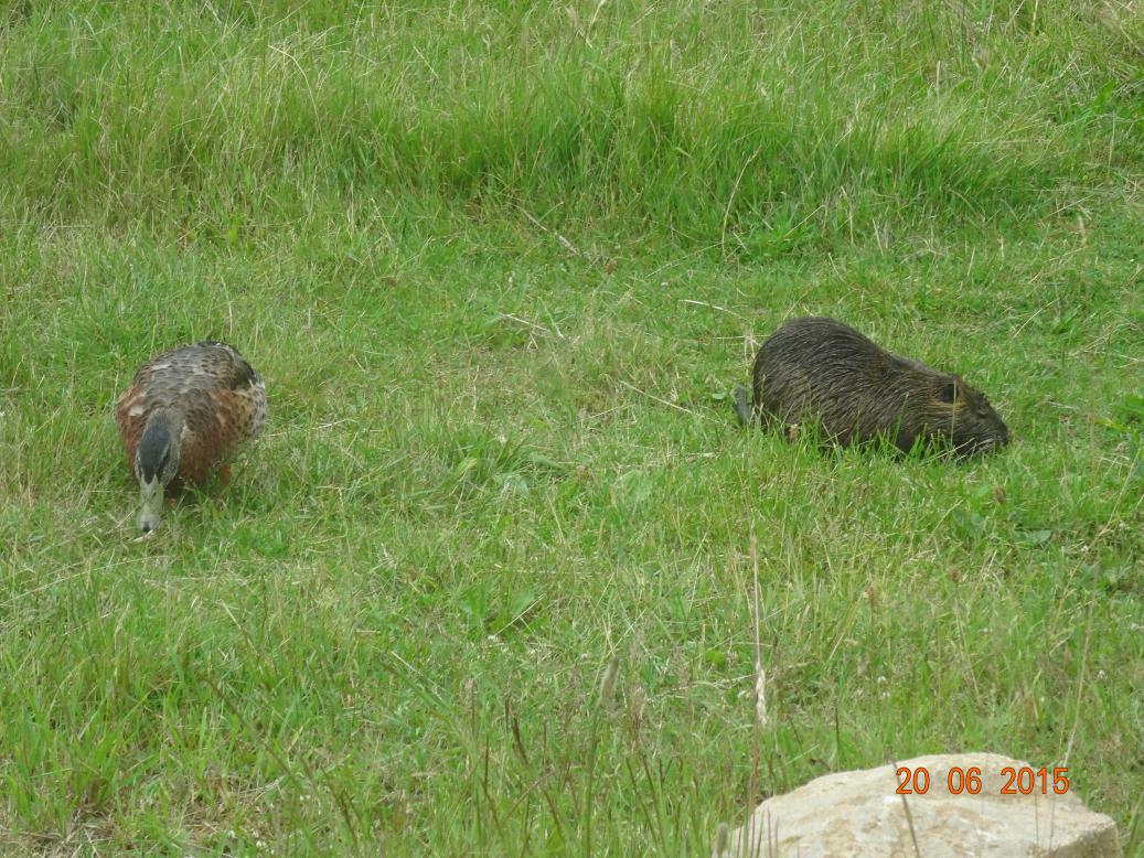 Thought you'd like to see our Coypu and one of the two ducks we have. The Coypu are normally very shy creatures and if anyone is around they scurry back to their hole in the bank of the pond. However, they're used to us and just look up and carry on grazing.