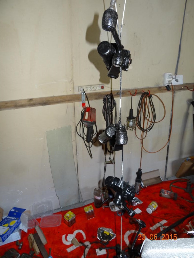 Shocking. The shockabsorbers hanging on astring having been painted. I expect the string to break with that weight but it's been OK so far.