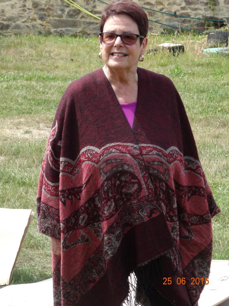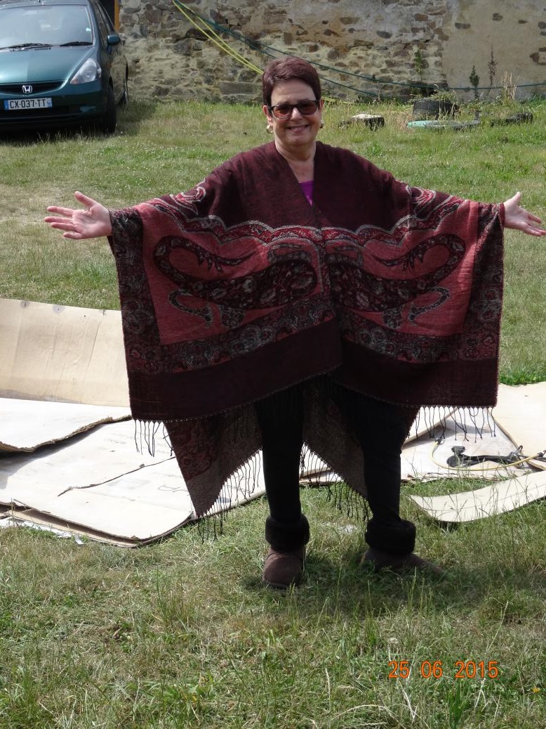 Lynne was telling me that she wanted a Poncho when we were in Sheffield but for some reason Tanya, our daughter, wouldn't let her buy one. So I bought one and it arrived today. You can see how happy she is.