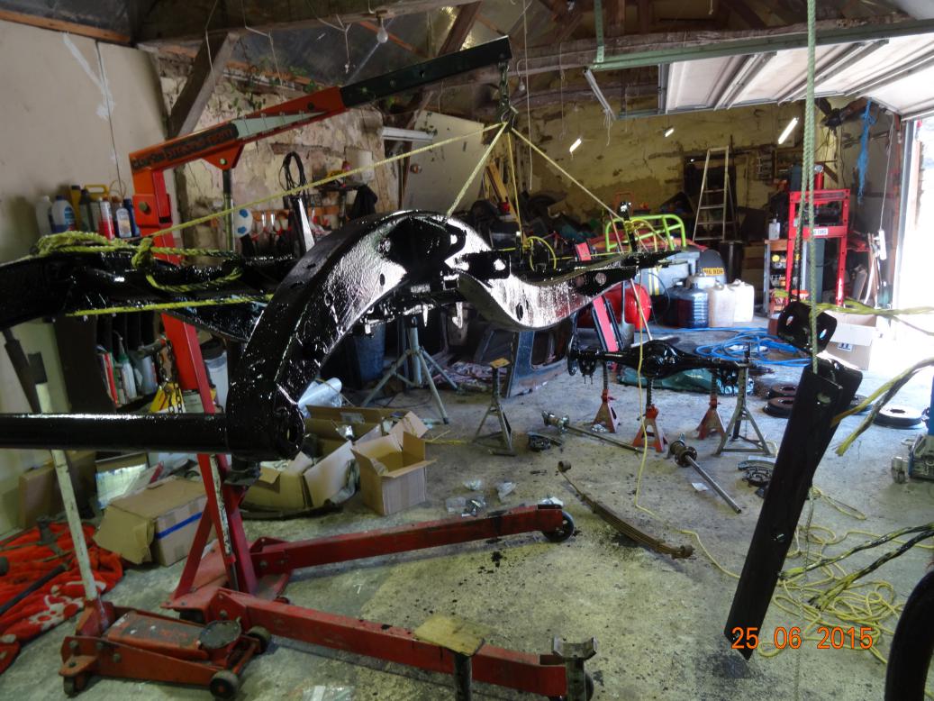 Chassis in the air. I'll put another rope on the front to lift it level and I can paint the underneath. At the moment it's had one coat but by feel not sight.