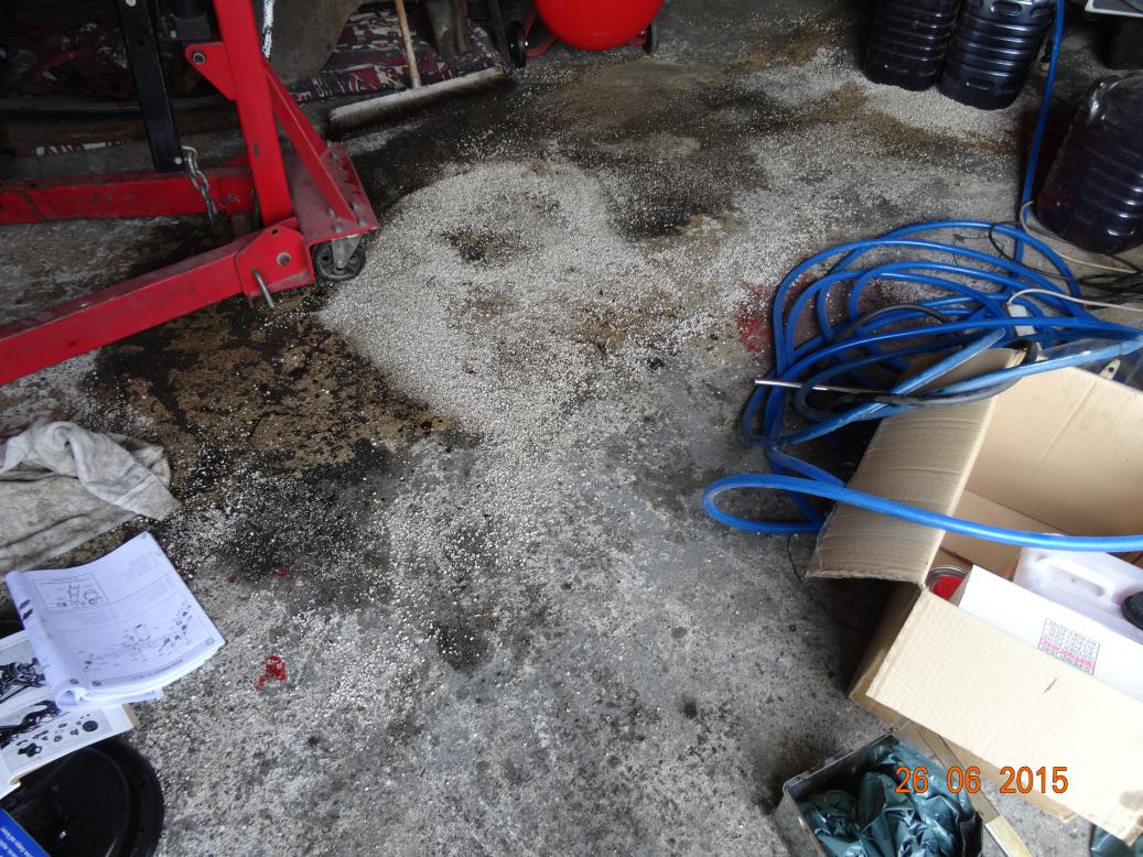 Cat litter on the oil spillage. It will suck the oil up and I'll sweep it up tomorrow. This is the second 10 liter bag I'd used.