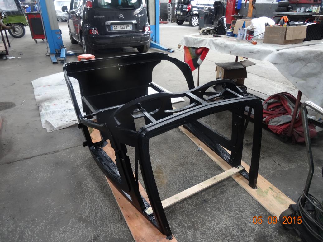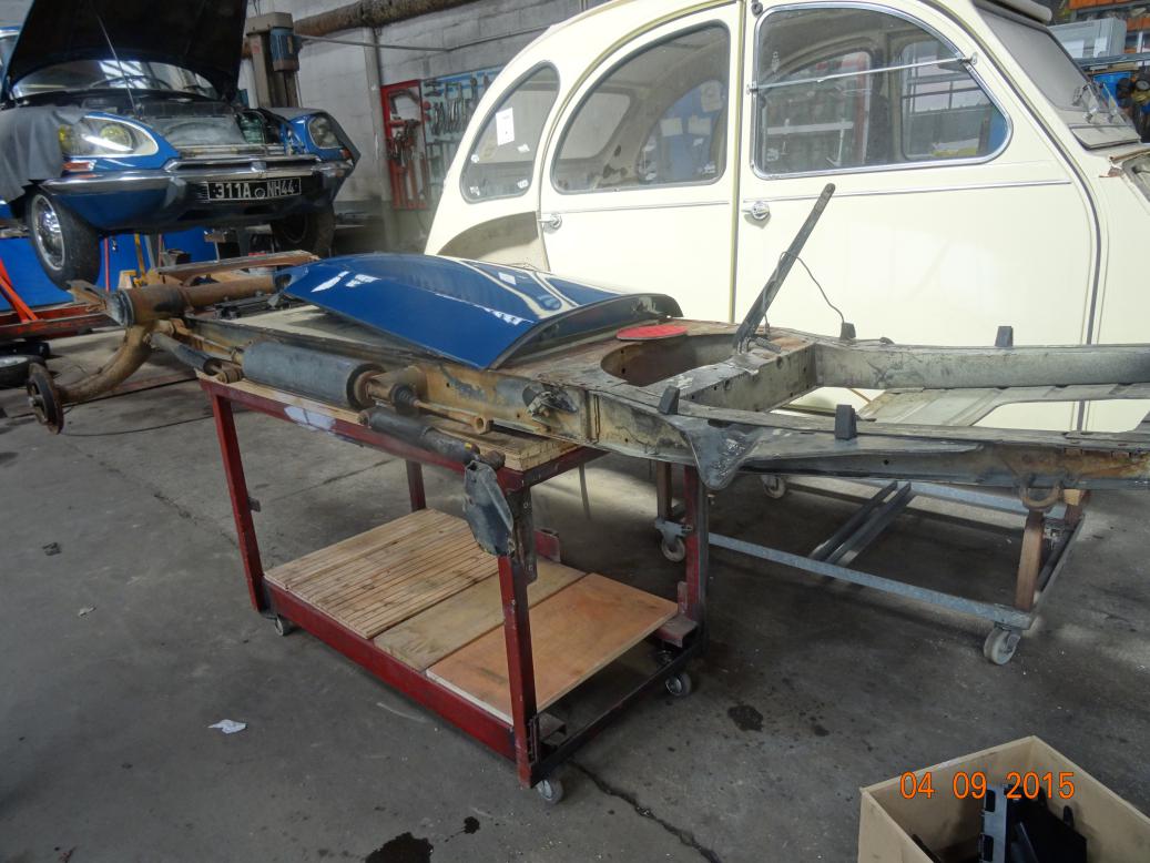 A Citoen 2cv chassis. the car it belongs to is the white one behind. The blue wing is off a DS......