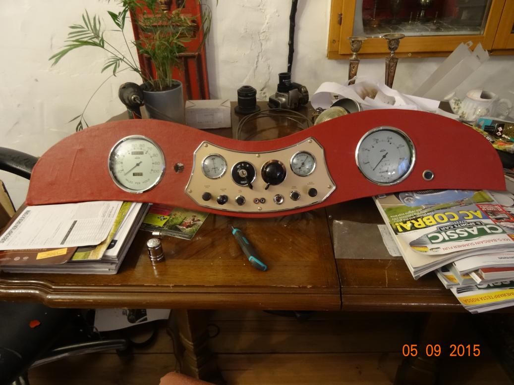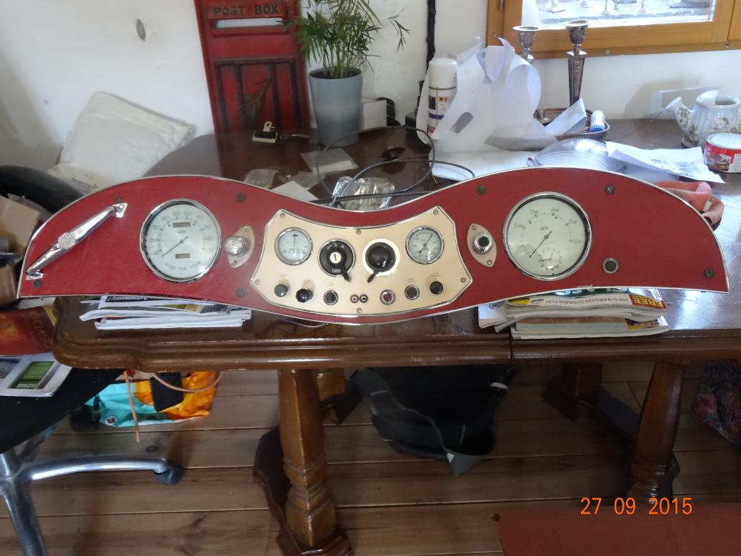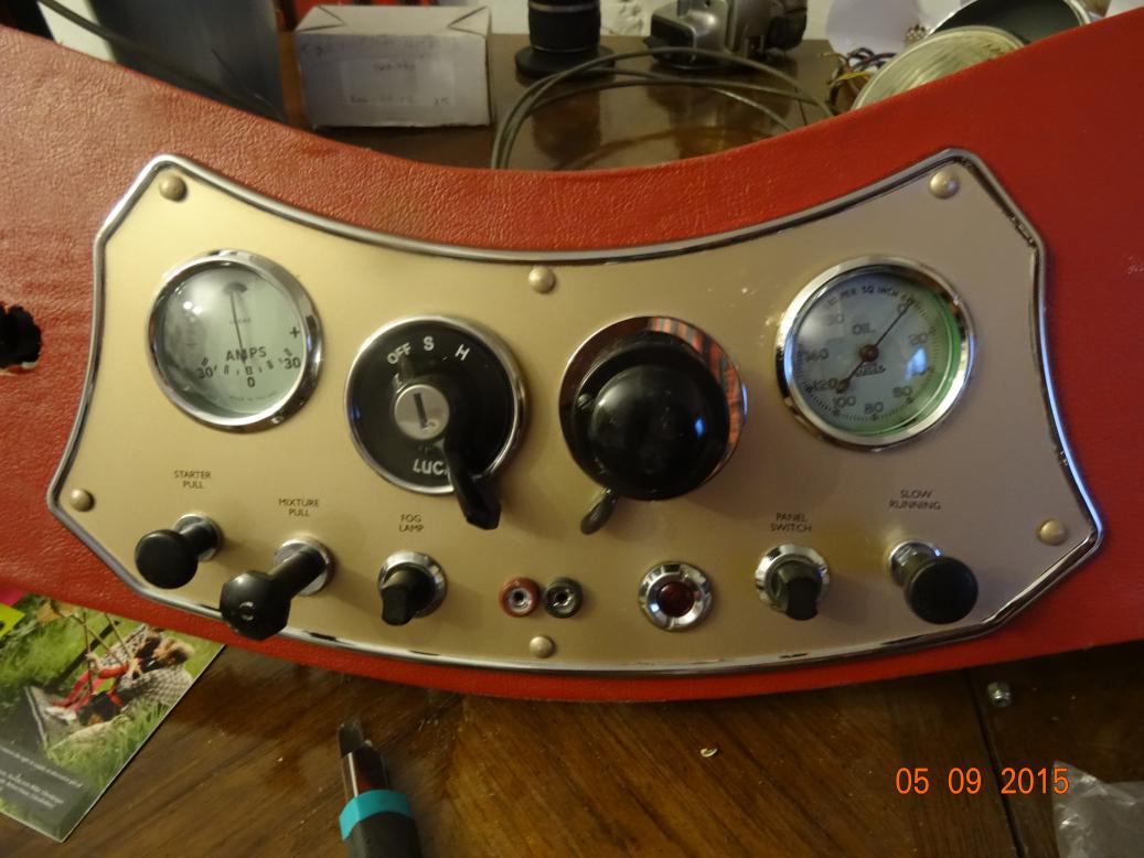After lunch I got changed and started work on the dash. Just finished at 2200. I still have the map light to fit but the gold paint is bubbling so I'll have to rub it down and do it again. I will also need a new 30 MPH warning lamp as I can't find the otiginal. I seem to remember the cover was missing. I do have the base.