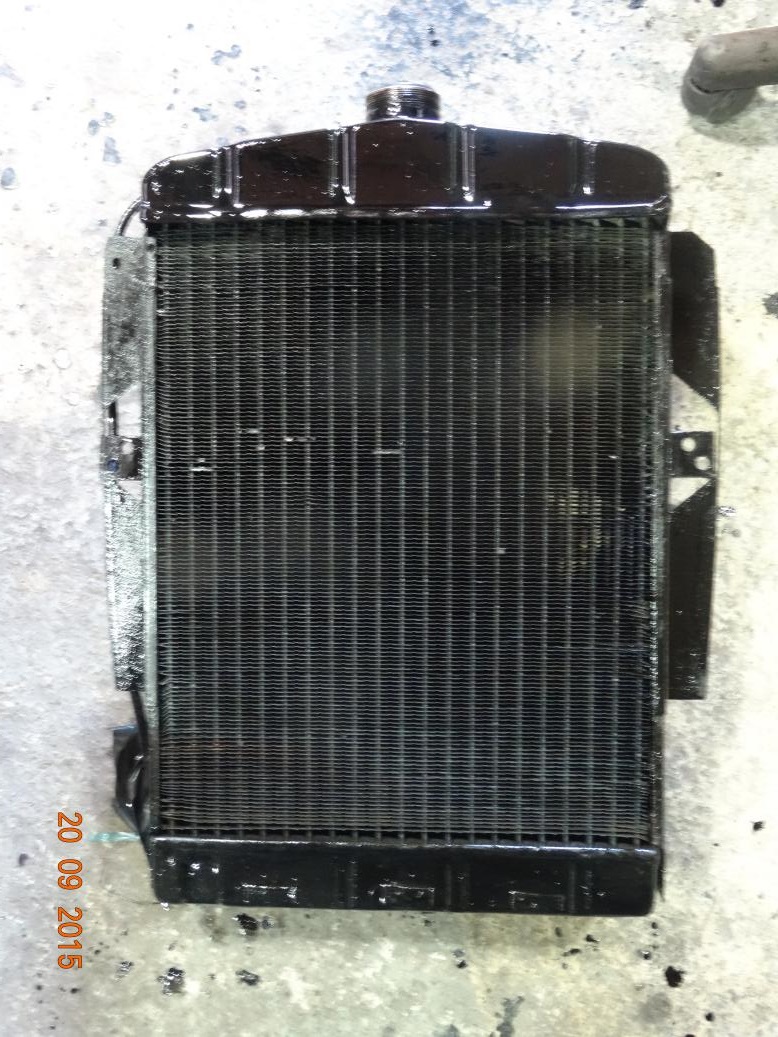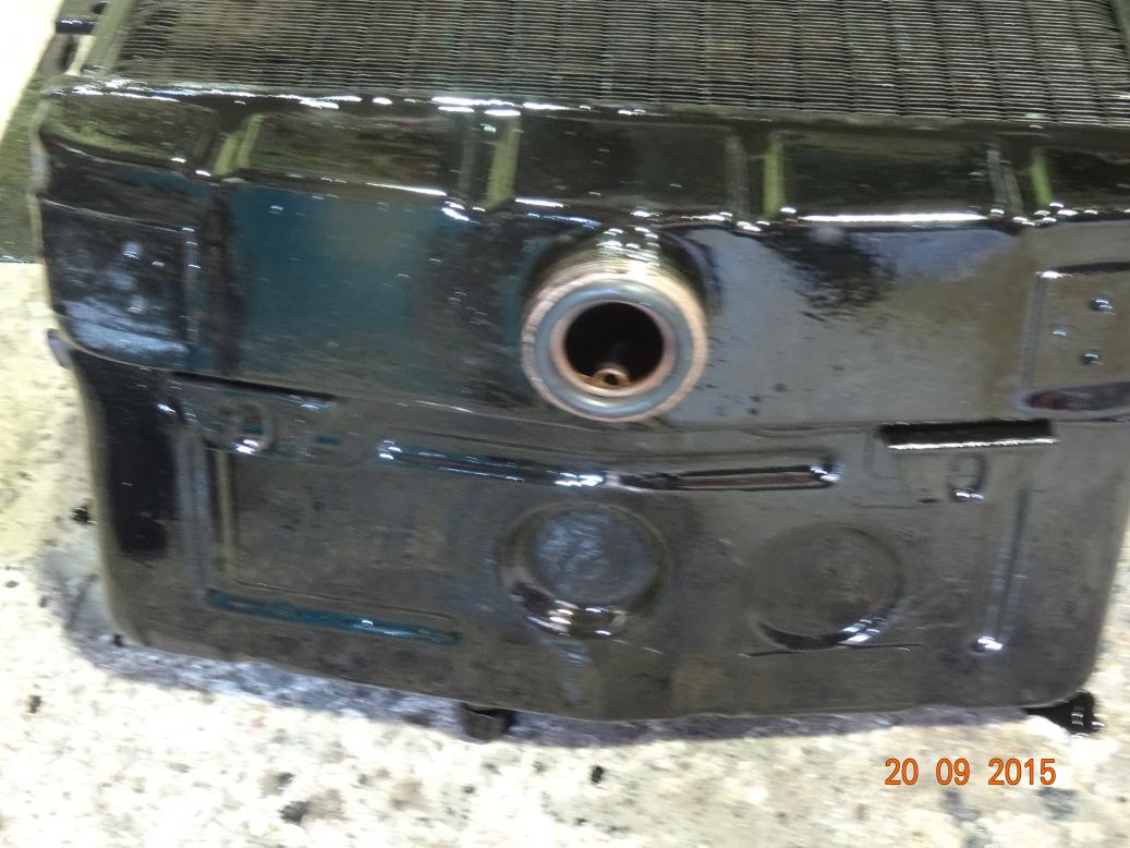 Early start, about 0830. Got all the radiator parts together and mixed the last of the phosphate with hot water. Used pieces of bin liner and elastic bands to seal the bottom hose pipe, cut the remaining top hose off aftrer breaking the rusty hose clip and sealed that with bin liner and elastic bands. Then put the rad cap on and covered that with bin liner, to protect it from getting scratched. \remove cap and fill rad with the phosphate. The stuff is running out the radiator about 7/8ths down. There is a series of holes in the core. I may be able to solder them myself but if not the bodyshop should know a rad repair shop. Rolled the rad around the field for a while than drained and flushed with the hose. Painted the rad and the new lower mounting bracket. When I opened the paint I poured some into a plastic dish, problem was the dish had a hole in it and the paint ran over the bubble wrap which the chrome shell was resting on. I then moved the shell to the floor so I could use the bench. You've guessed it, the newly painted slats got black paint over them! I wiped most off and had enough paint left to spray one more coat. I will have to go to the body shop tomorrow as I think the rad fixings are there with the other body fixings.