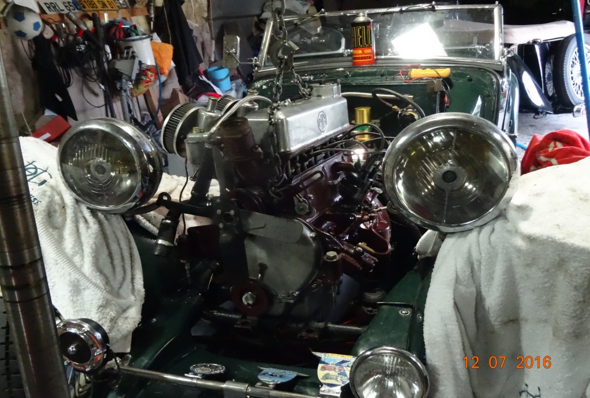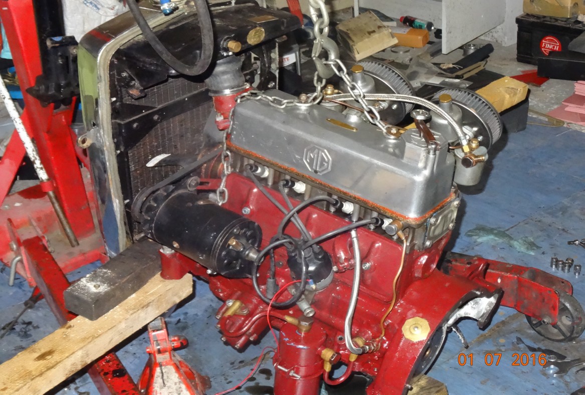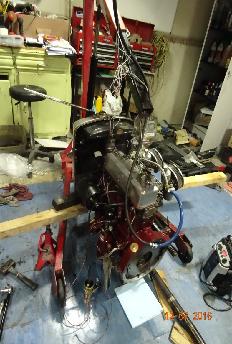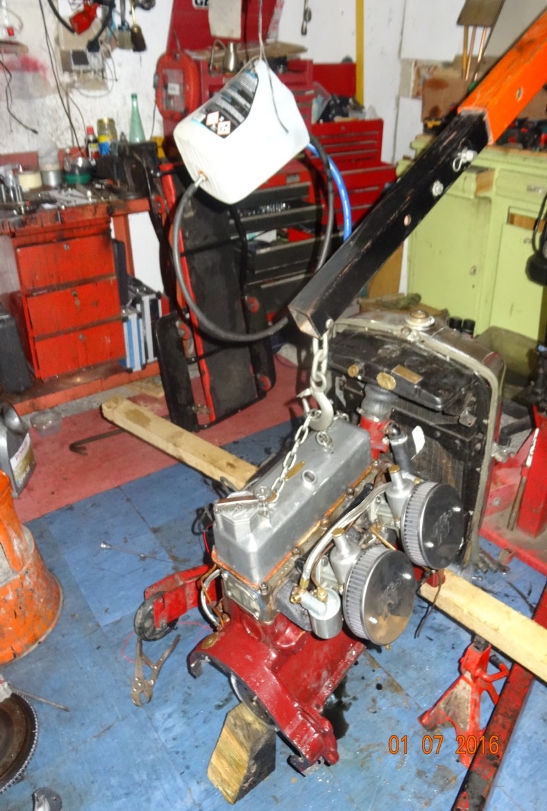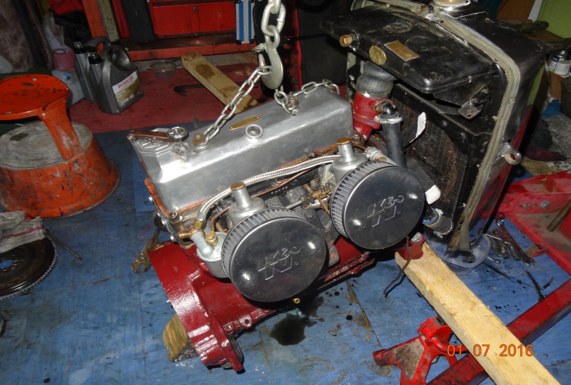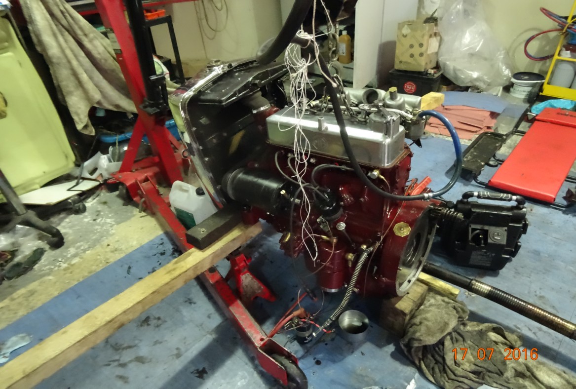 Early start and got the engine running with another coil. Ran for an hour with no leaks. Spent rest of the day refitting the engine. Doing the top half was fairly easy as I've sorted out the incorrect bolts and nuts and used 3 matching metric bolts and nuts on the downpipe. So I wasn't guessing which spanners to use. However doing the underneath was agony on my back. Finished about 1800, moved the car out, mine in and then the other back in. My engine will come out tomorrow. A big thanks to Lynne who worked the crane when we put the engine back in. She also helped me put the bonnet back on. Best mate I've ever had...