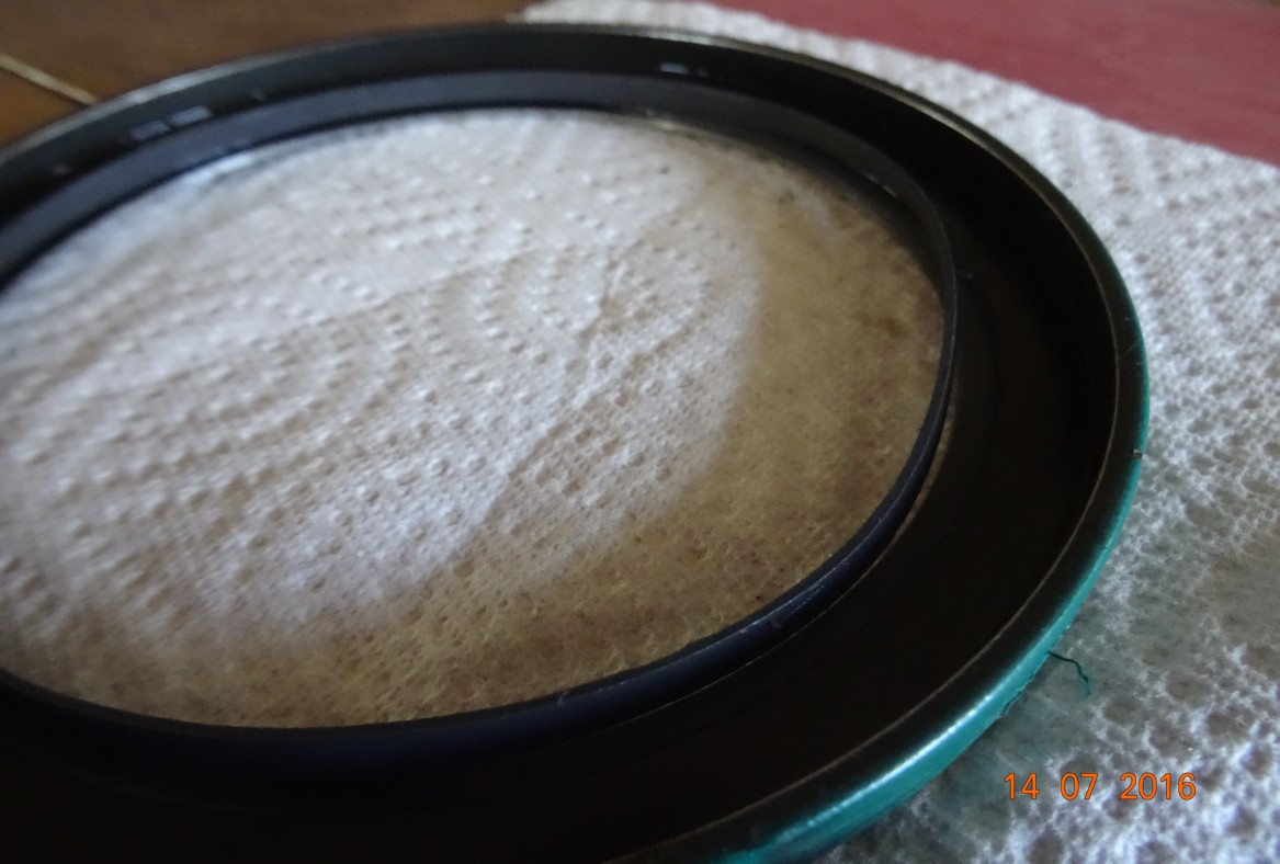 The bottom of the seal housing has oil on it but no talc. Clue that the seal is leaking.