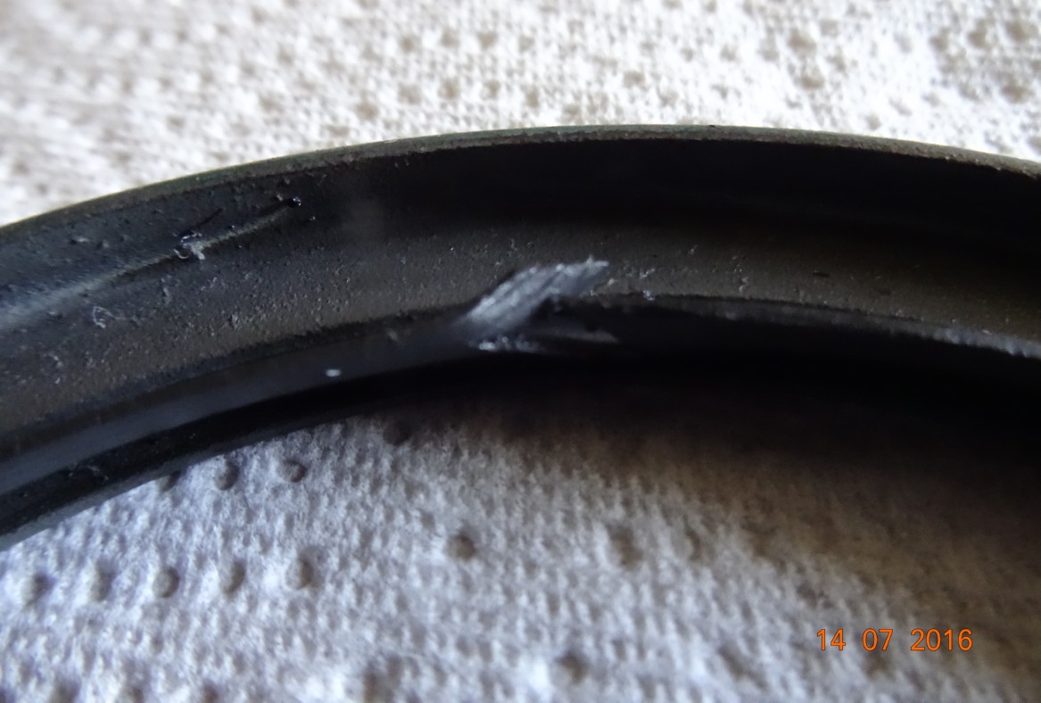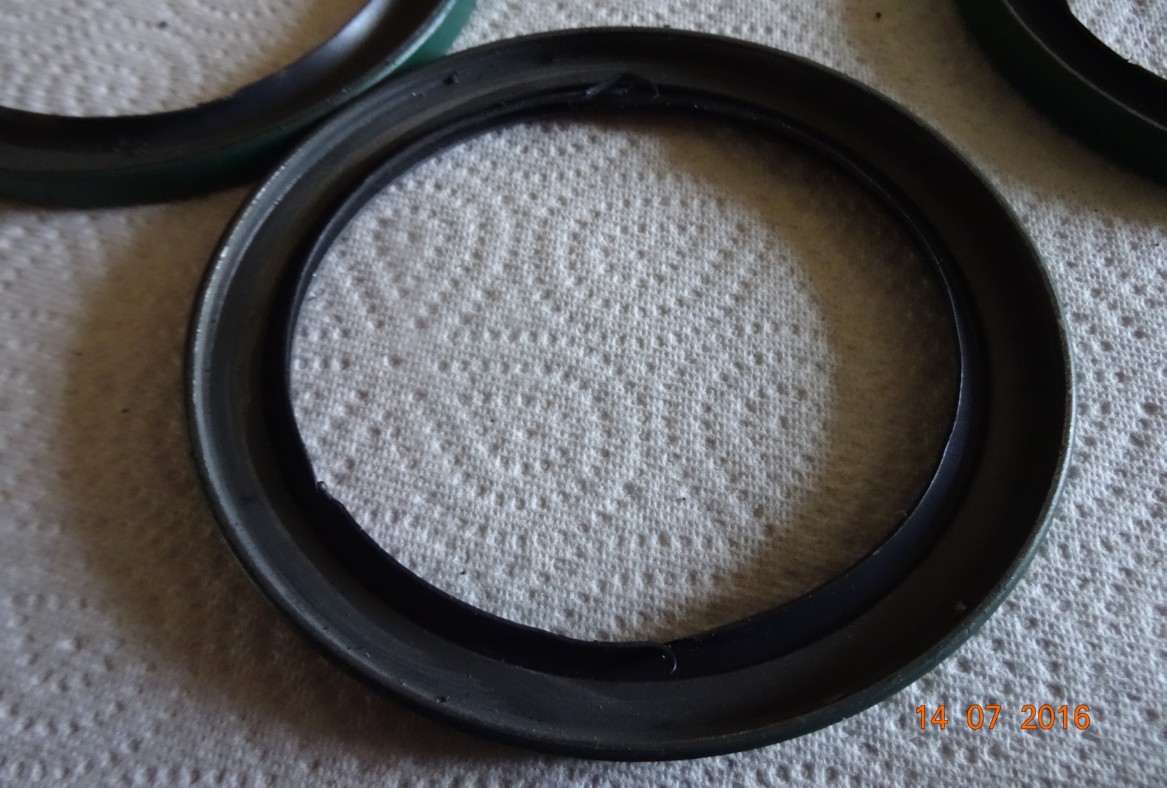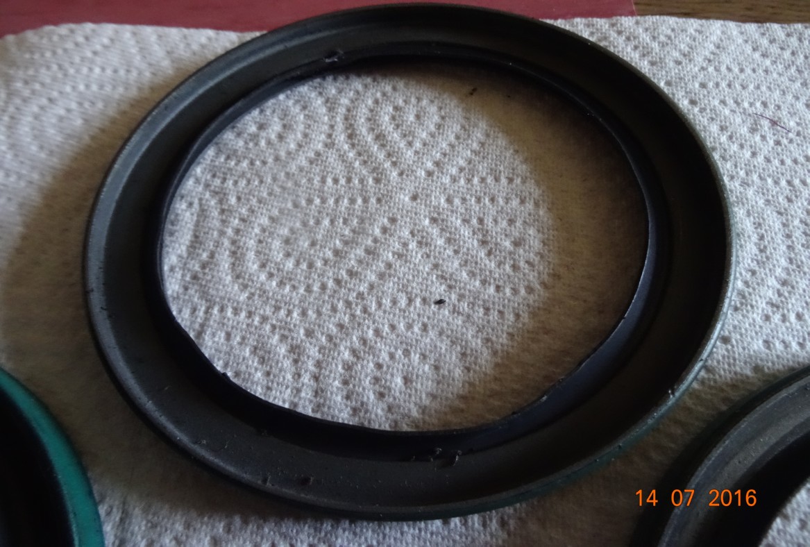 You can see the damaged lip. All these damaged lips were cut by the edge of the sleeve even when I put tape over the edge. I'll take responsibility as I was on my own when pushing them on (except for the last one fitted) and it's not easy to align and push without help. This is the old stock seal where the lip isn't recessed.