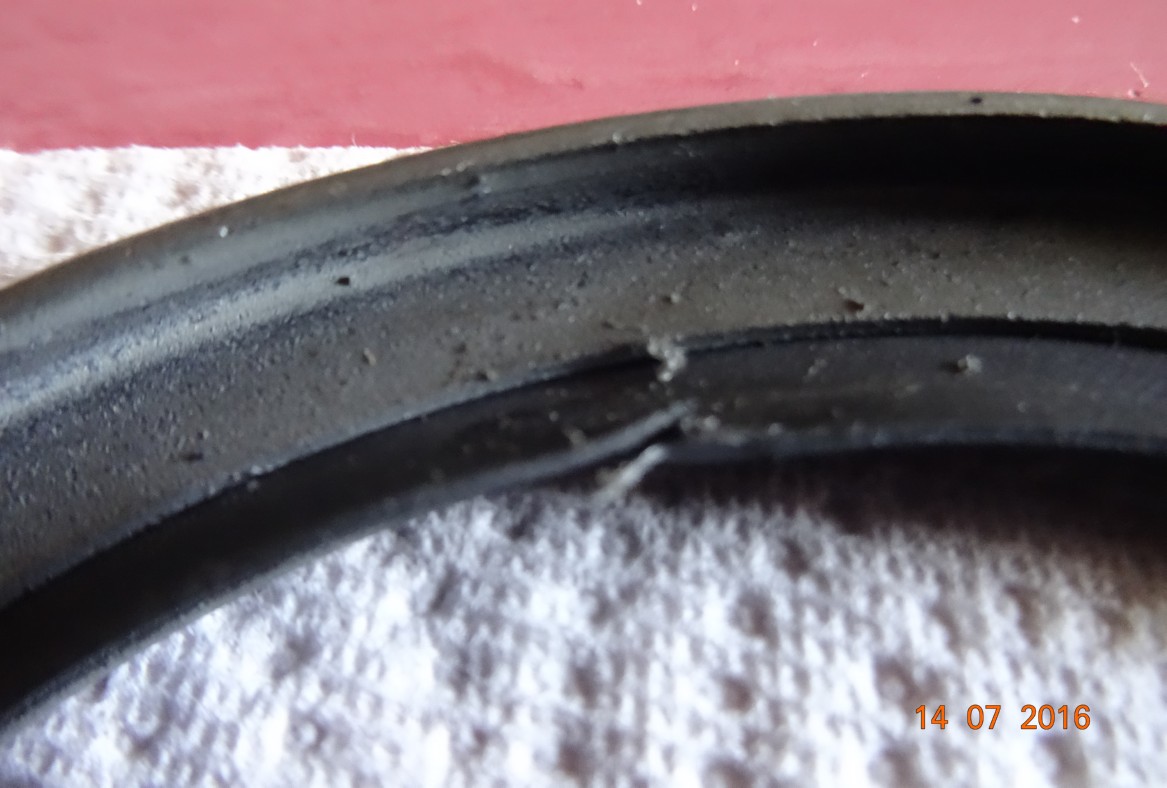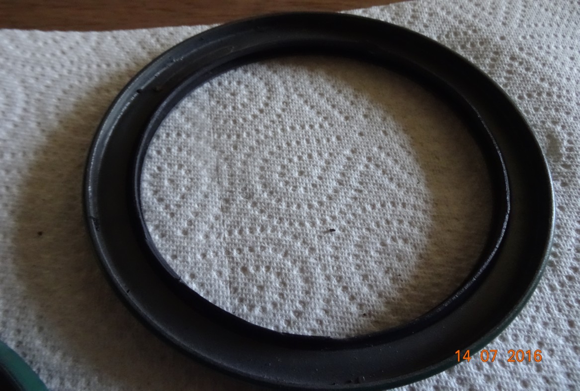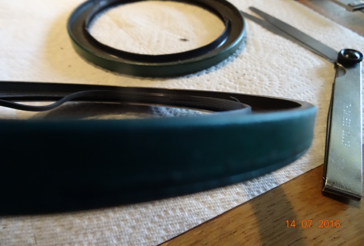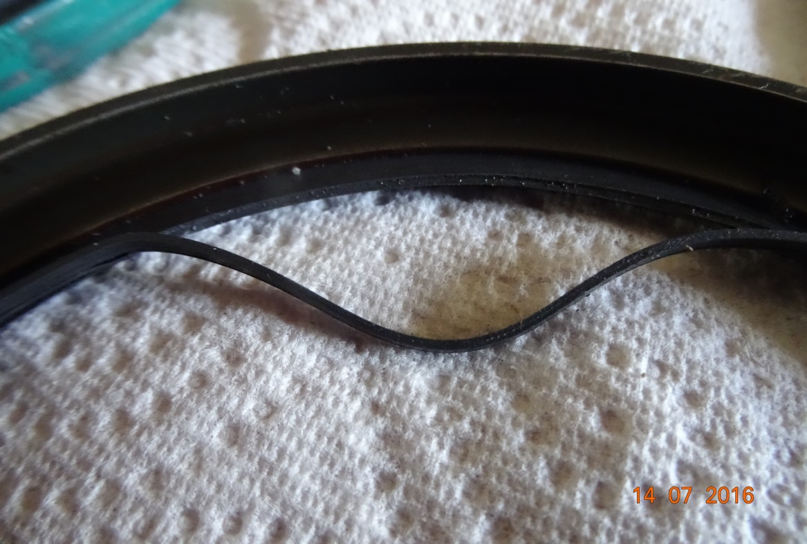 You can see the damaged lip. All these damaged lips were cut by the edge of the sleeve even when I put tape over the edge. I'll take responsibility as I was on my own when pushing them on (except for the last one fitted) and it's not easy to align and push without help. This is the old stock seal where the lip isn't recessed.