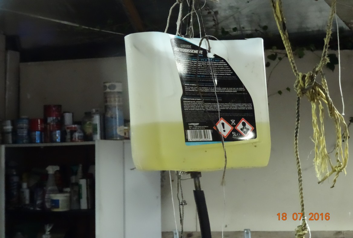 The petrol supply. I have to stand on the stool to fill, wobbling all over the place. But Gavin's tall enough just to pour it in.