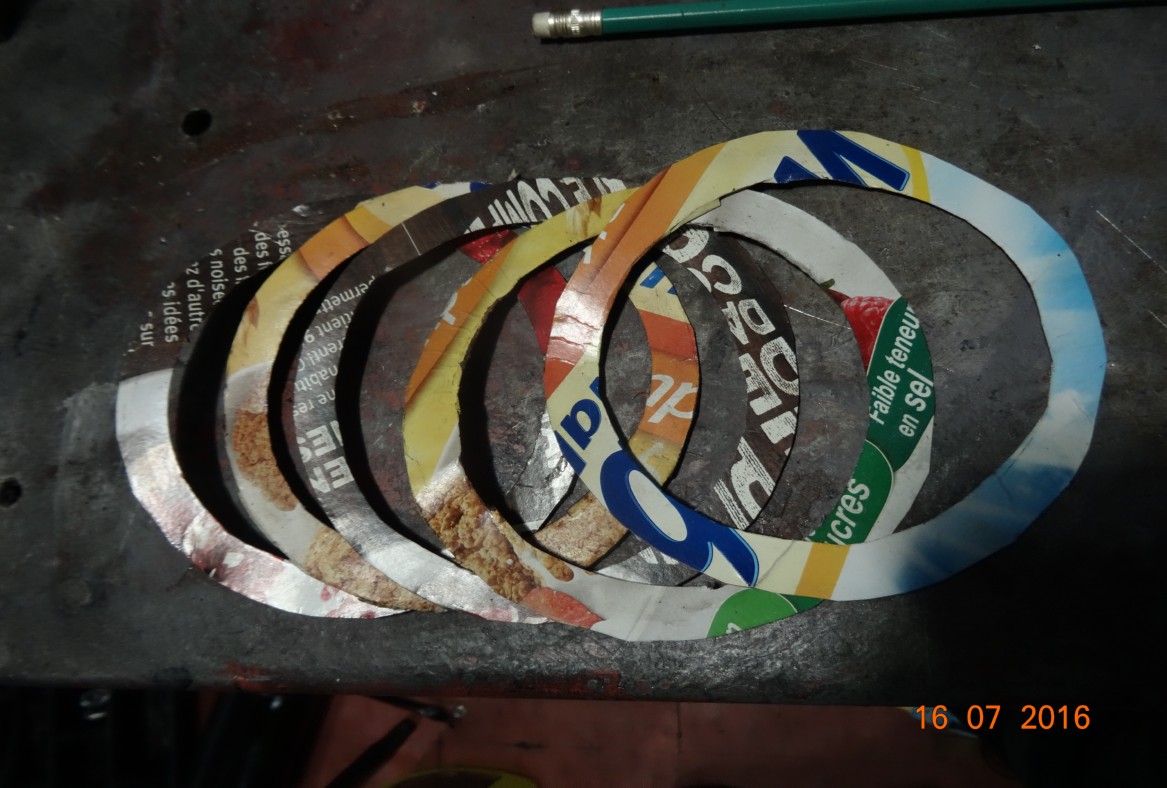 So, I make 5 rings from a Weetabix packet (what else are cereal packs for?) and cut a groove in the flywheel 0.060” deep.