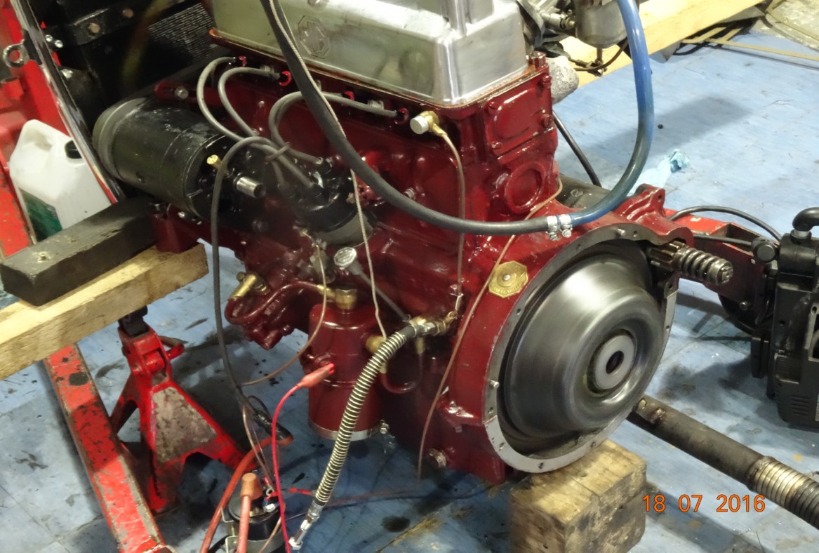 When I stared the engine, some months later there were no leaks. The engine probably ran for two hours before being driven. On 28th May the bodyshop finished and I drove the car home, about 24 kilometres. When I got home I noticed oil under the car. Lifting the bonnet, I saw oil coming from the starter aperture. It was running out, not dripping. Engine was quickly taken out. Turned out that when I painted the engine I had “sealed” the drain hole at the bottom of the bell housing which was now half full of the oil running out of the seal.